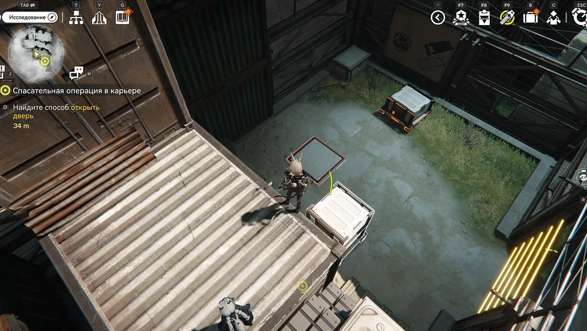 На другой стороне нас встретят закрытые ворота, активирующиеся нажатием на две панели рядом. Сначала поднимаемся по коробкам справа и взаимодействуем с грузоподъёмником. Выходим через пустой контейнер справа и передвигаем двойной ящик к жёлтой решётчатой зоне.