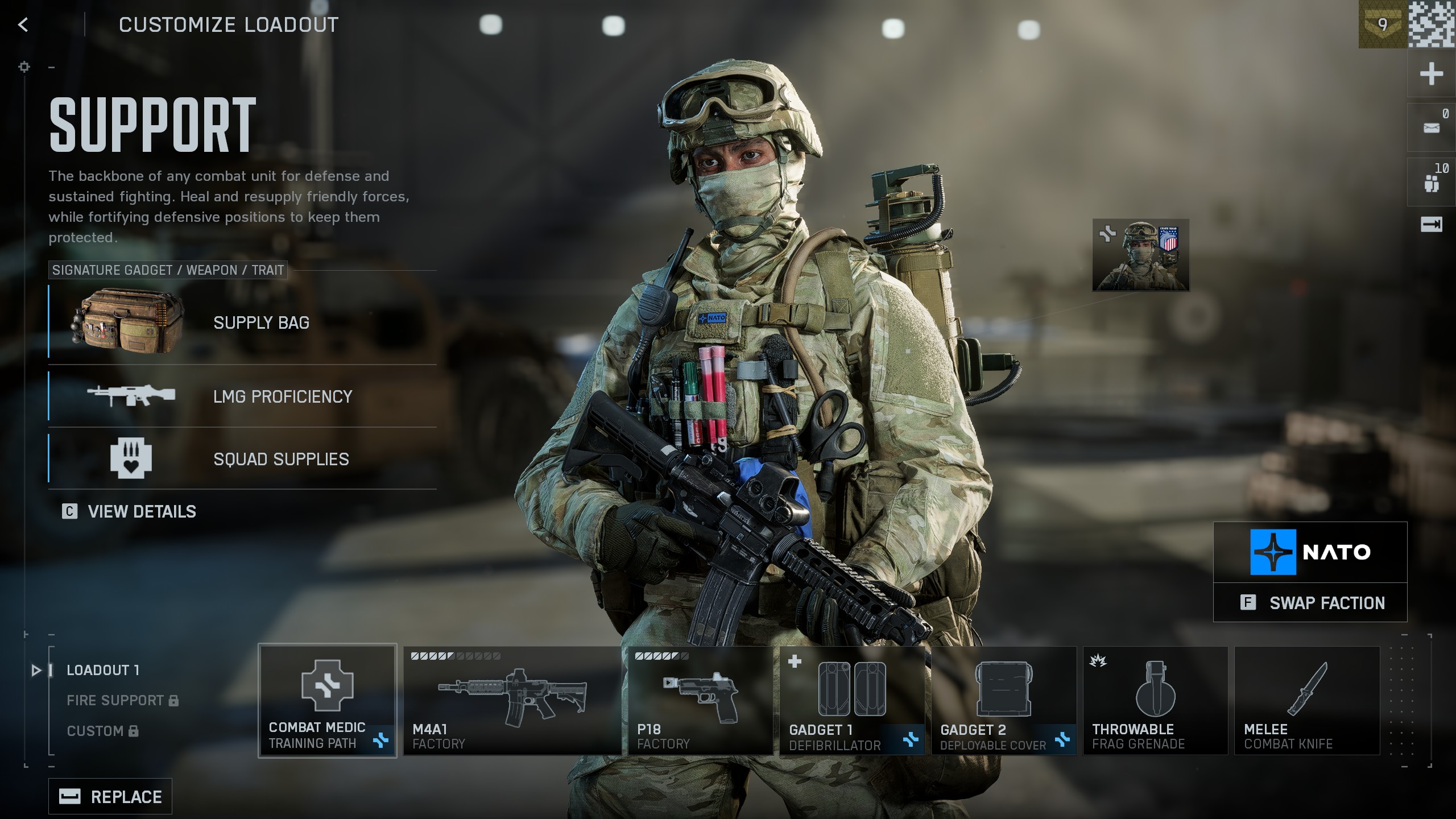 - Combat Medic: поднимает союзников на 20% быстрее любыми способами; помощь раненым запускает регенерацию вашего здоровья; характеристики всех защитных гаджетов повышены.