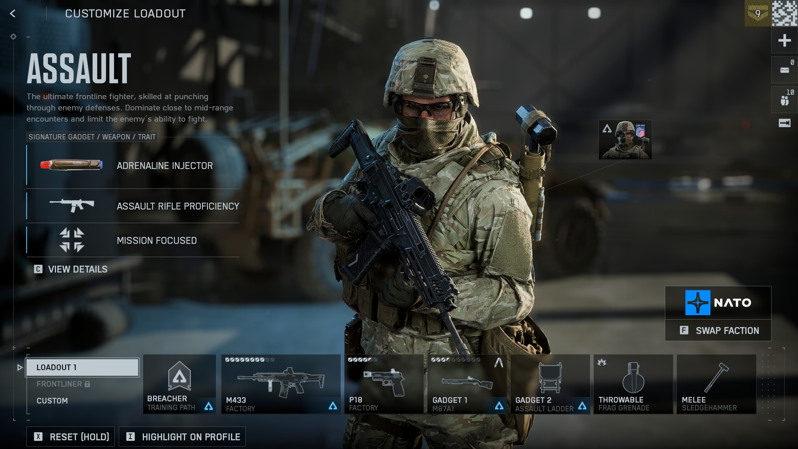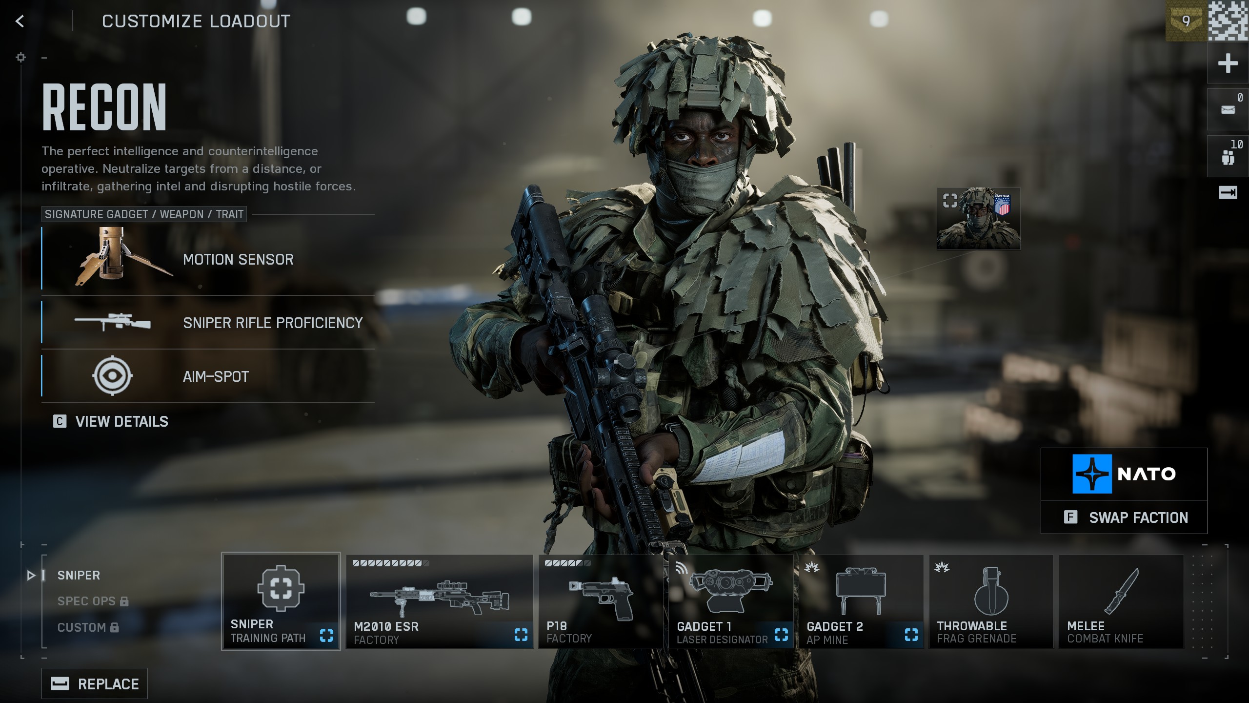 - Spec Ops: вы тише перемещаетесь в положении сидя и тише устраняете противников стелс-атакой ножом. Если не используете спринт, вражеские гаджеты вокруг помечаются автоматически. Также в приседе быстрее снимается вражеское обнаружение.