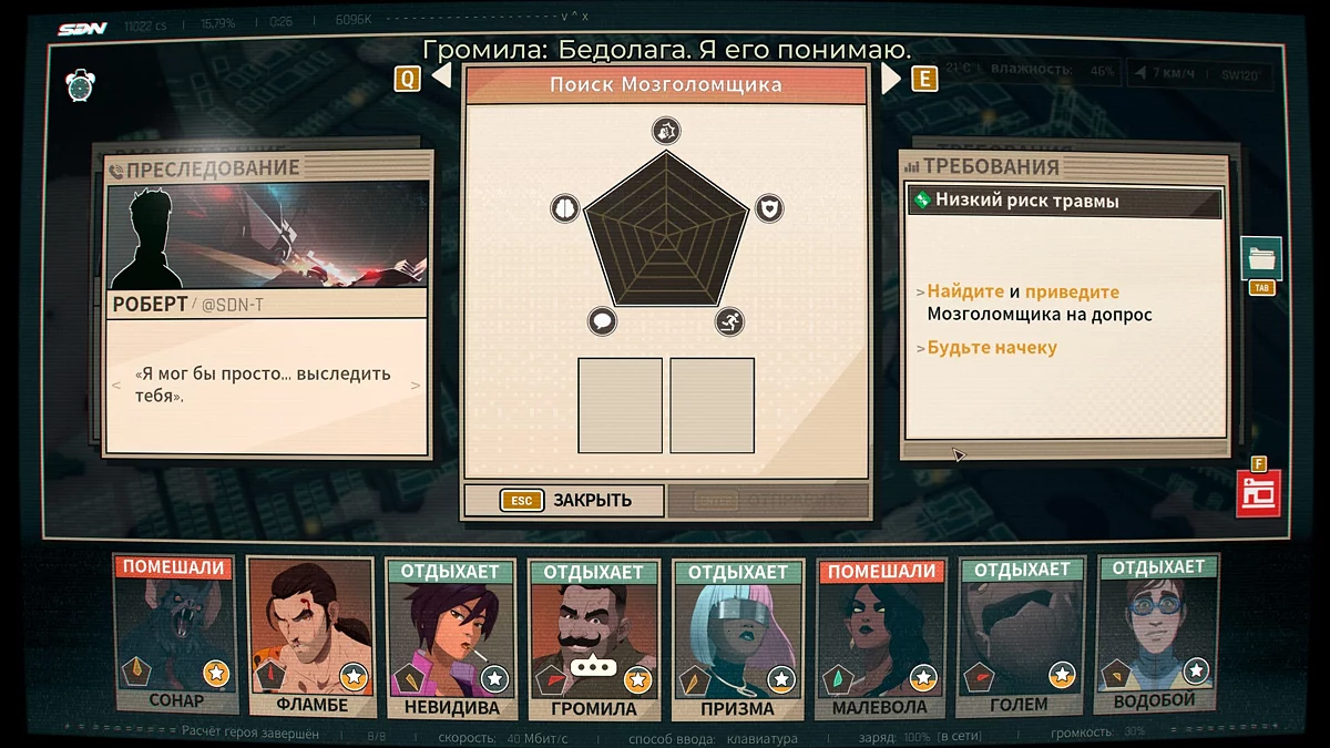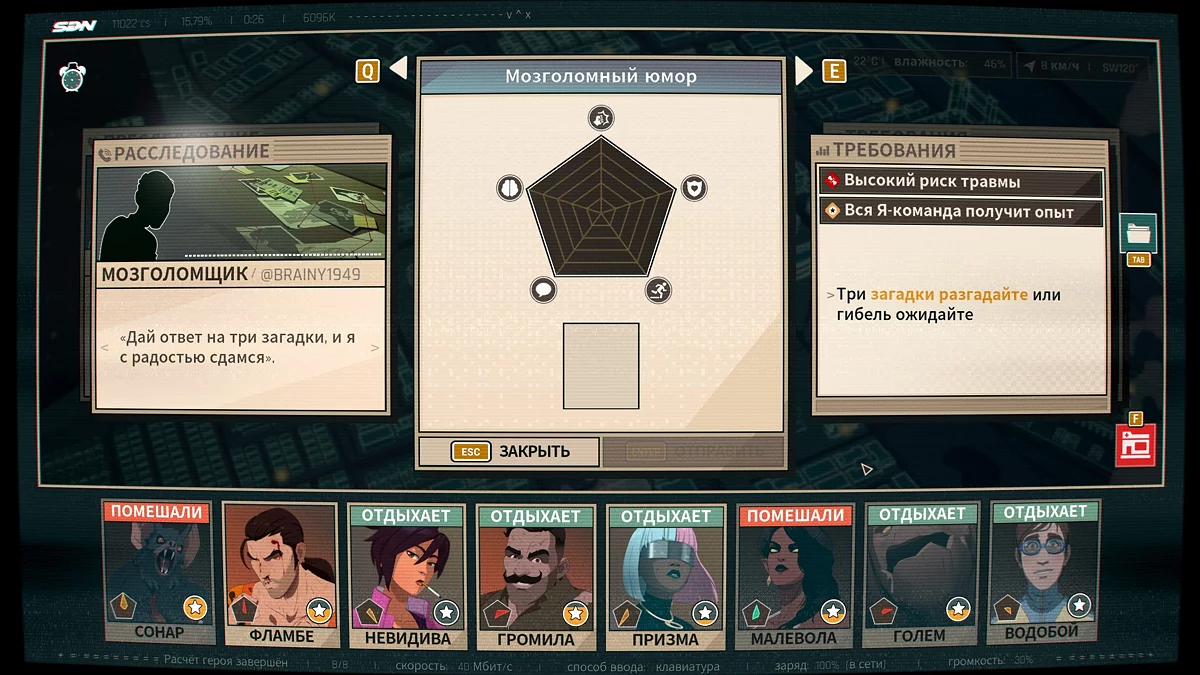 Dispatch — самобытная игра на стыке интерактивного кино и пазла. Сюжет повествует о Роберте Робертсоне, занявшем место диспетчера эксцентричной команды супергероев-аутсайдеров. В одном из эпизодов вы столкнётесь с испытанием «Мозголомный юмор» из четвёртой главы «Реформа». Ниже объясним, какие ответы давать Мозголому и как без ошибок закрыть эту заявку. ✅