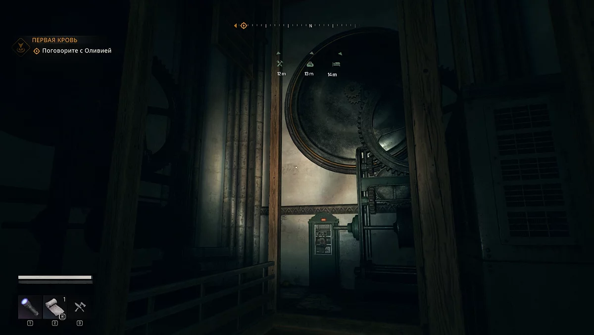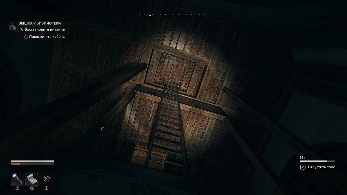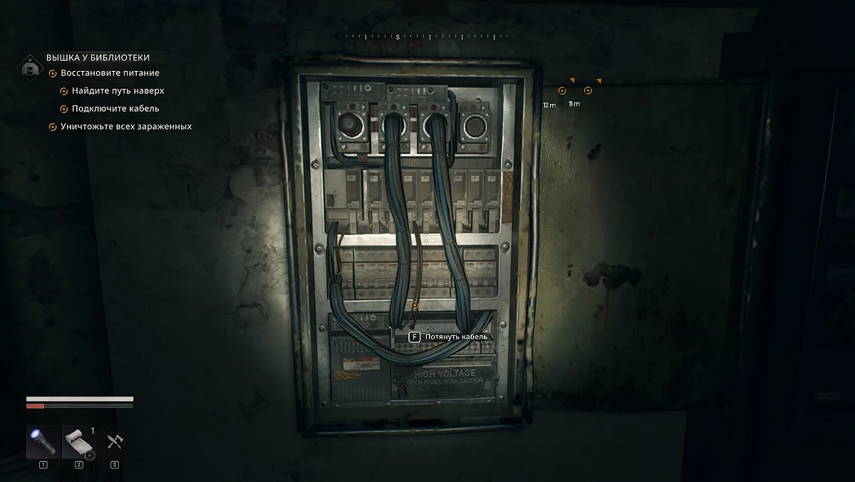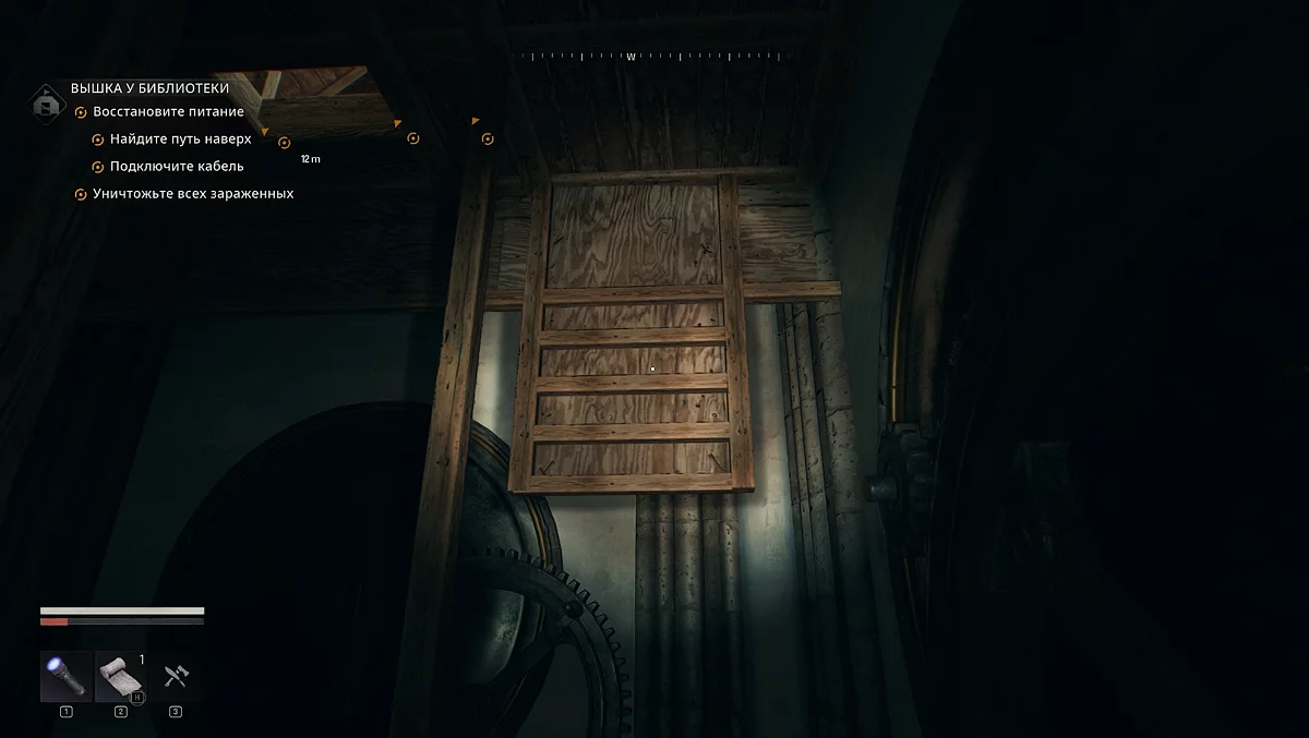 Здесь сначала активируйте генератор. После этого необходимо протянуть кабель к одному из четырёх механизмов в комнате, чтобы подняться наверх. Нужен тот, который находится в дальнем левом углу напротив генератора. Он включает механизм, вращающийся против часовой стрелки, и так мы сможем забраться выше. Хватаемся за металлическую перекладину, затем перепрыгиваем на деревянную часть и продолжаем подъём. Будьте осторожны: здесь могут быть зомби. Сбросьте лестницу, по ней спуститесь вниз, чтобы взять кабель и протянуть его к щитку наверху.