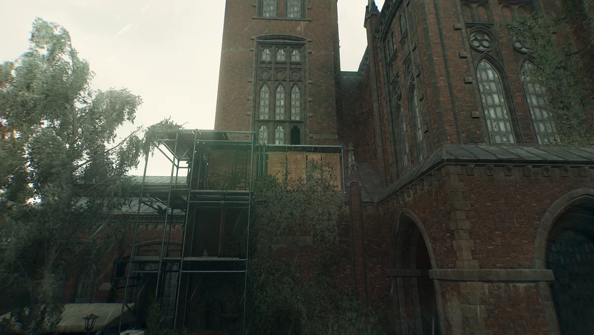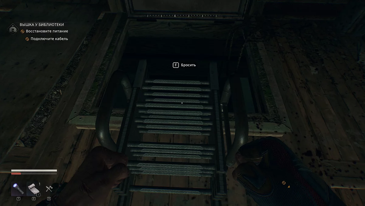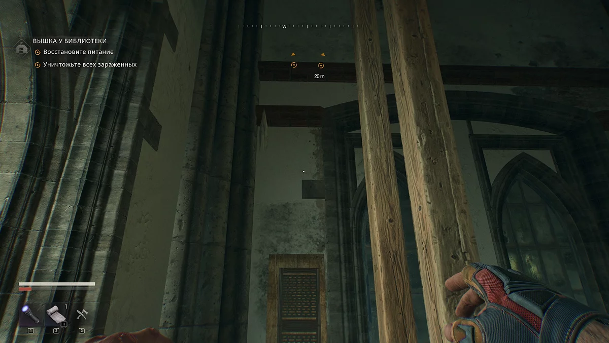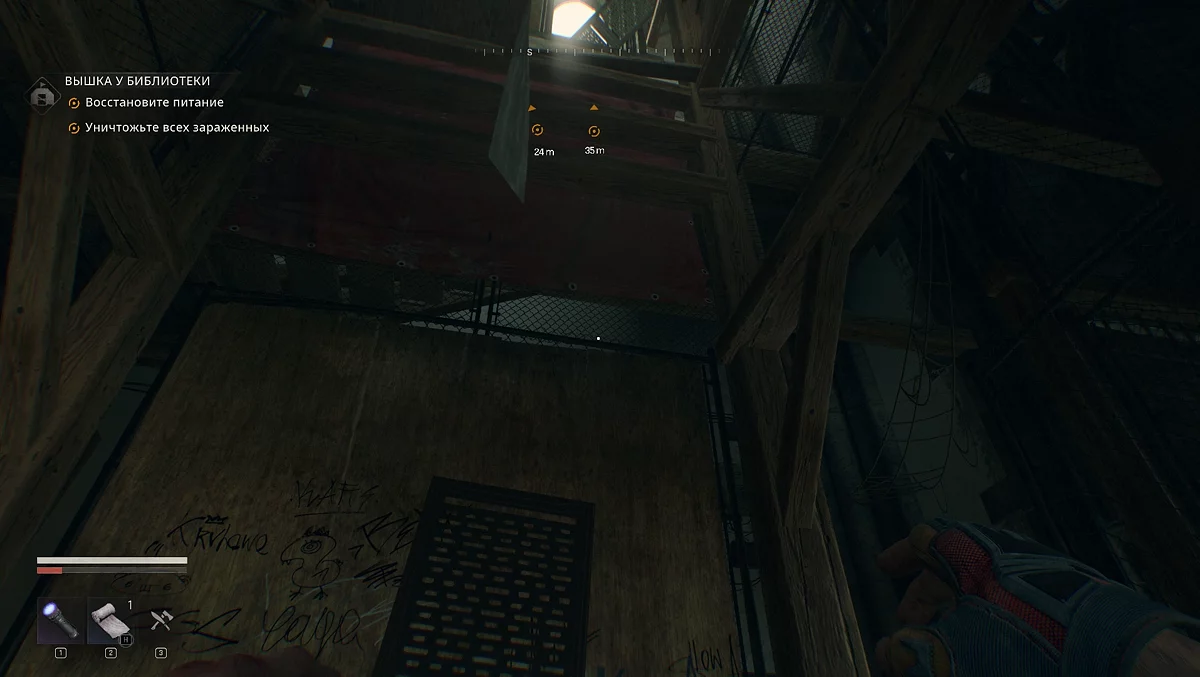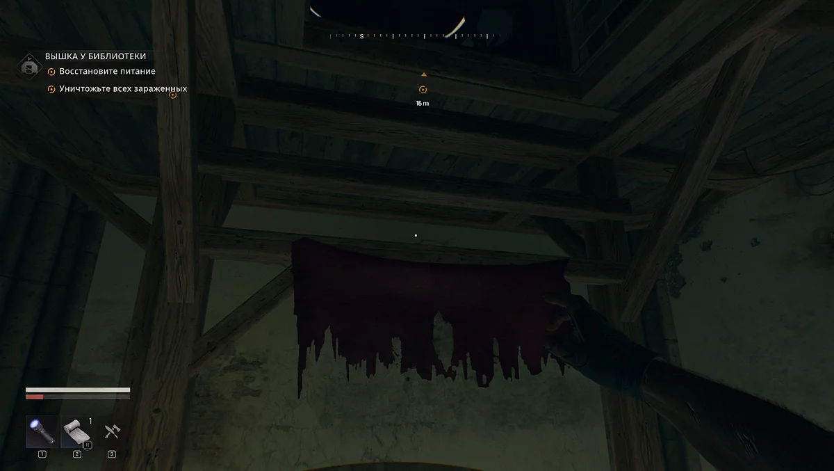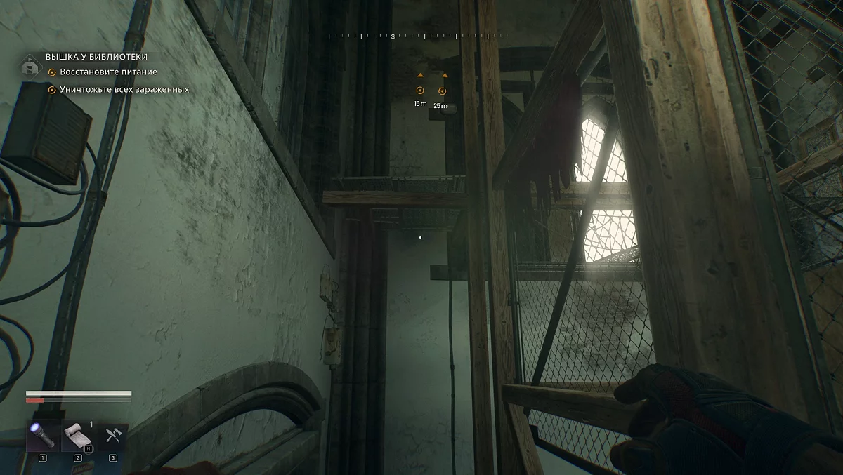 Поднимайтесь по строительным лесам к разбитому окну. Внутри вас ждут несколько заражённых — устраните их, прежде чем продолжить. Карабкаемся по выступам, идём по перекладине, прыгаем на поддоны. Лезем на красный кирпичный карниз, перепрыгиваем и переходим на деревянную перекладину. Смещаемся вправо и прыгаем на перекладину с красной тряпкой.