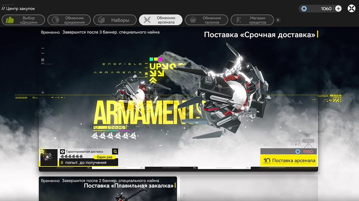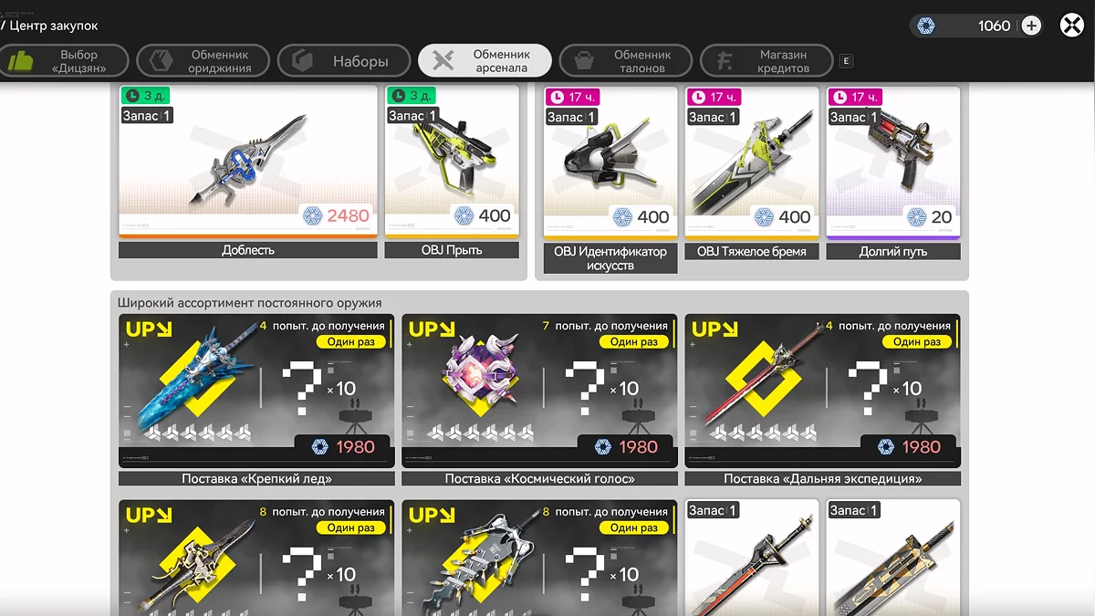 Механика оружейной гачи заметно отличается от круток персонажей. Вместо прямого расхода ороберила используется отдельная валюта — билеты арсенала.