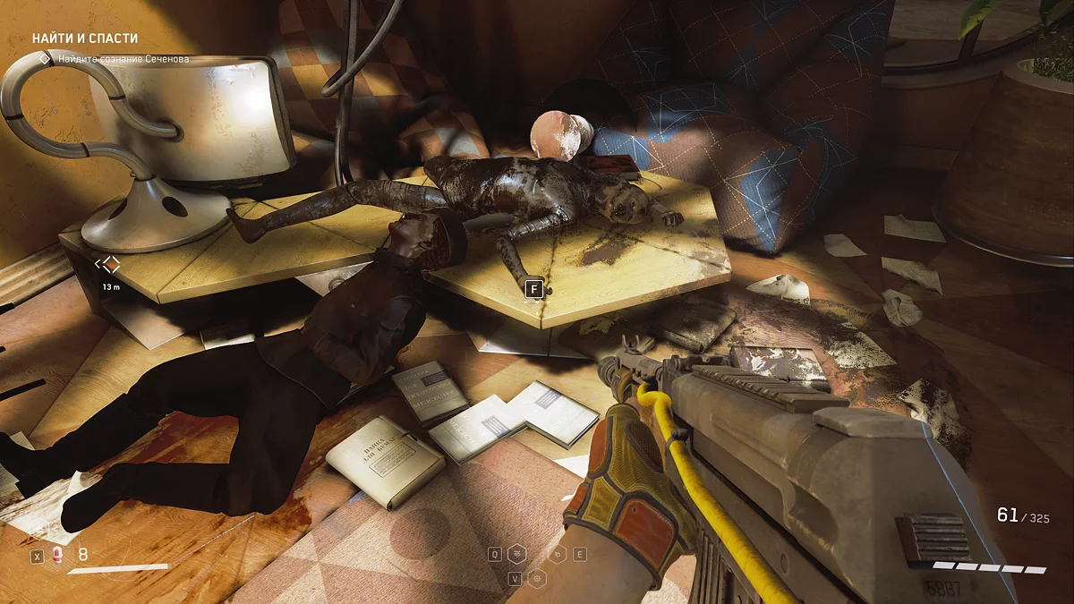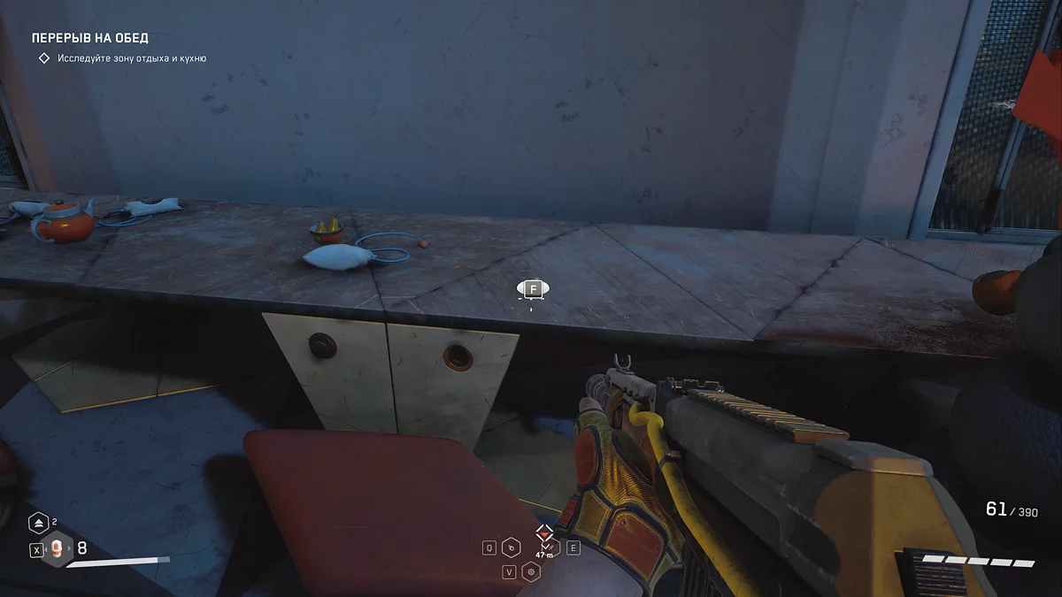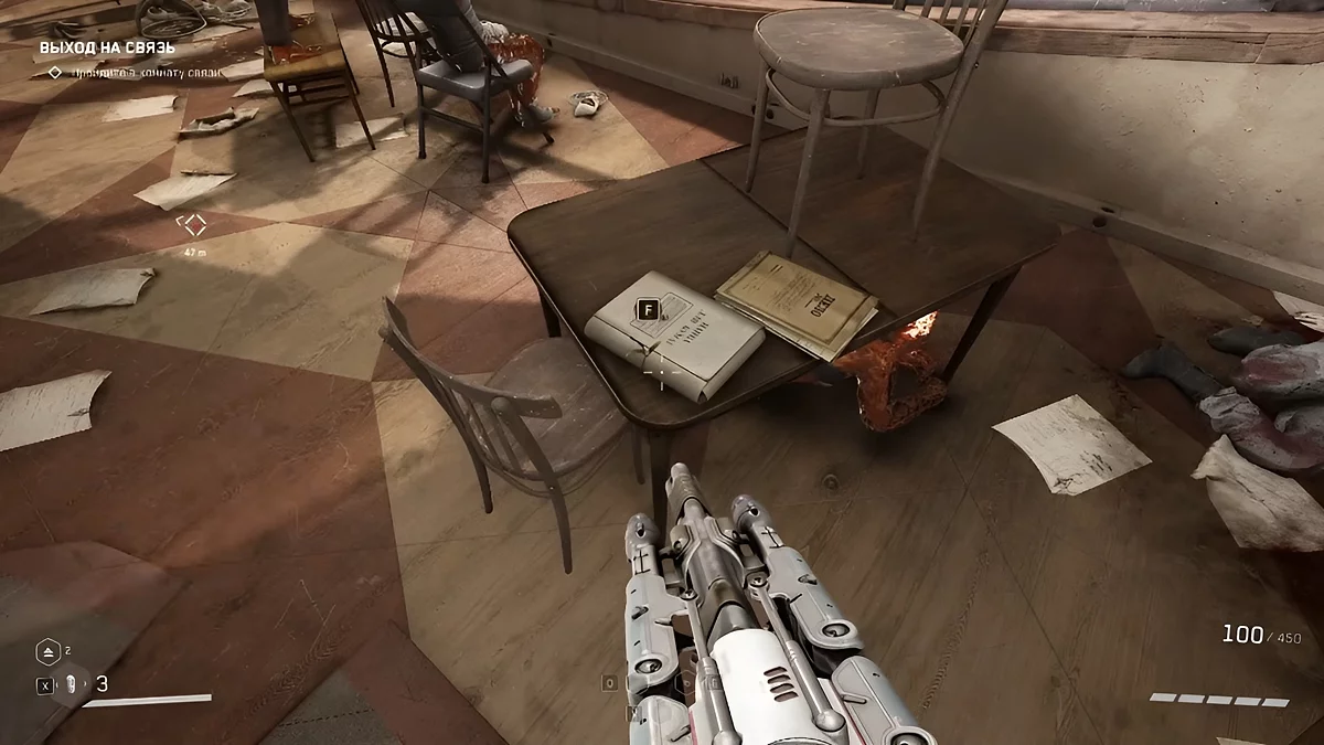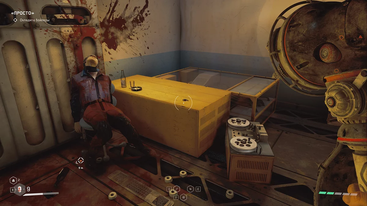 Получив задание охладить бойлеры из категории «Просто», подойдите к столу, за которым на стуле сидит труп 💀 — он расположен в правом верхнем углу от лестницы. Там вы найдёте третий щебетарь.