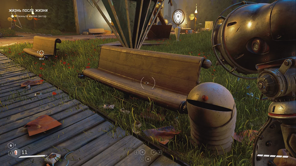 Отворите ворота в парк, поговорите с Валидолом 💊 и покиньте башню. Затем двигайтесь по левой тропинке, пересекая парк. У скамейки, рядом с которой лежит полиморф, отыщется ещё один щебетарь.