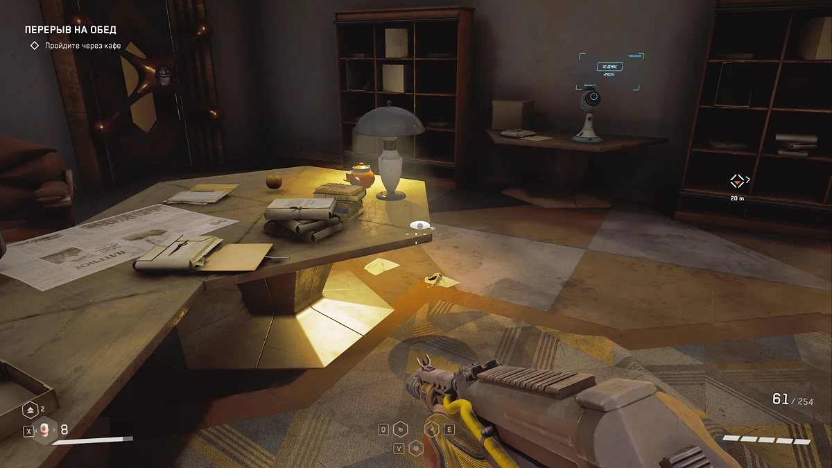 Одолев «Беляша» 🐻 на заднем дворе кафетерия, проследуйте по открытому Настей коридору, но не выходите на зелёную жилую площадку. Вместо этого загляните в комнату слева перед воротами и возьмите восьмой щебетарь, лежащий на столе.