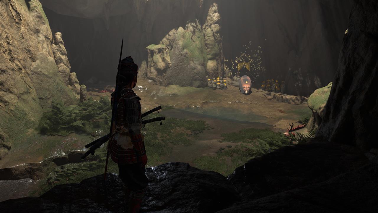 От входа на хребет Токати двигайтесь на юг до Низины Исикусу. Проход к пещере перекрыт бамбуком — срубите его и расправьтесь с диким медведем внутри 🐻. Можно и обойти: поднимитесь на холм и спуститесь по выступу в ту же пещеру с тыльной стороны.