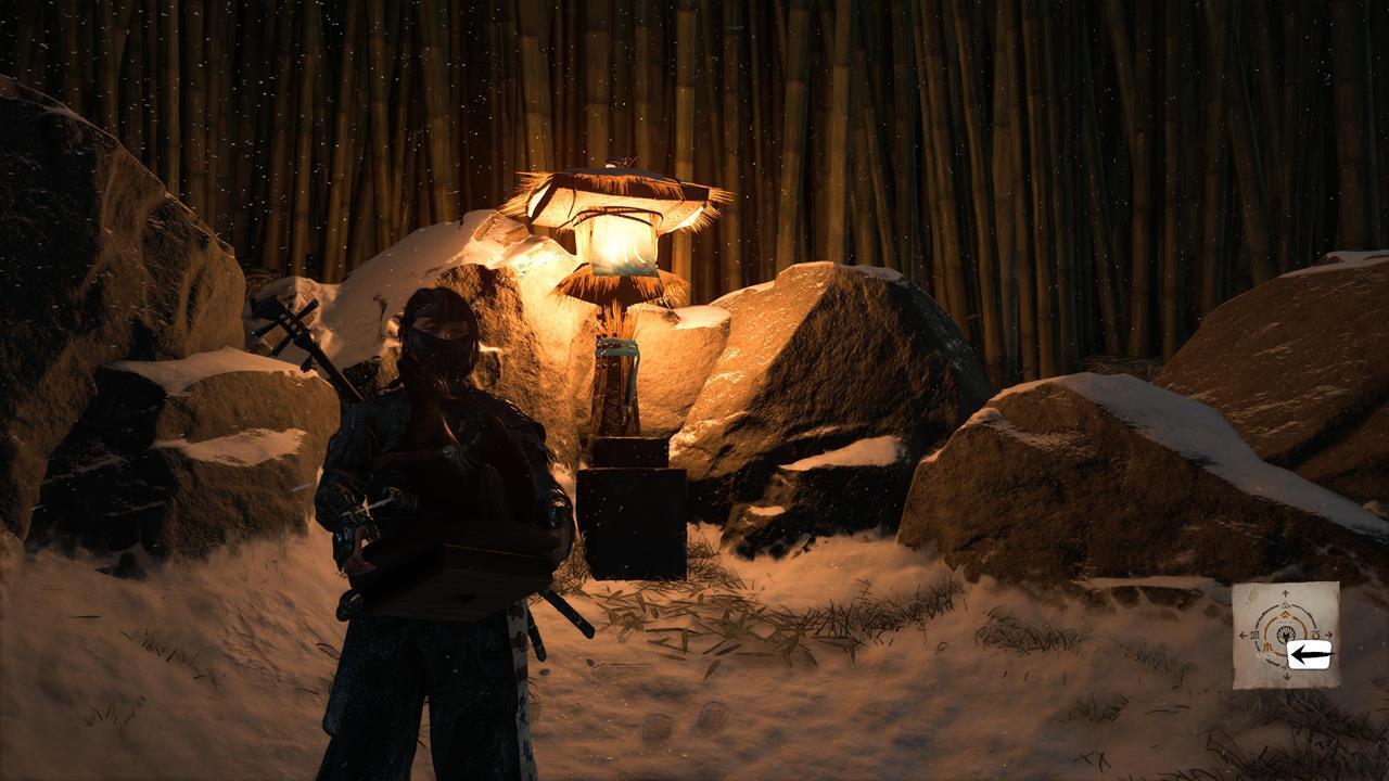 Чтобы открыть этот Алтарь для размышлений, поднимитесь на вершину скалы северо-восточнее алтаря №7. С помощью крюка преодолейте пропасть 🪝. На верхушке вы найдёте записку с предупреждением: музыка может разбудить медведя 🐻. Сыграйте на сямисэне прямо на месте, где лежит записка, чтобы запустить кат-сцену. Когда ронин уйдёт, он опустит лестницу на соседнюю скалу. Поднимитесь по ней и взберитесь на противоположный утёс.