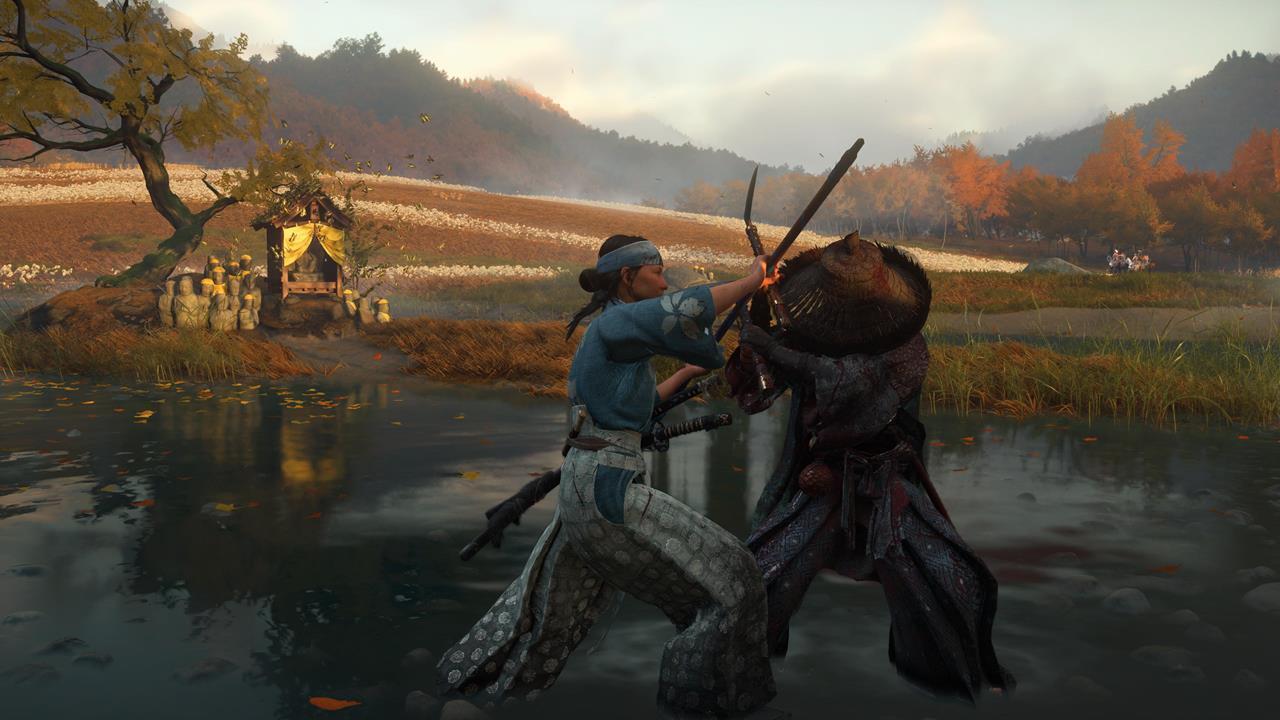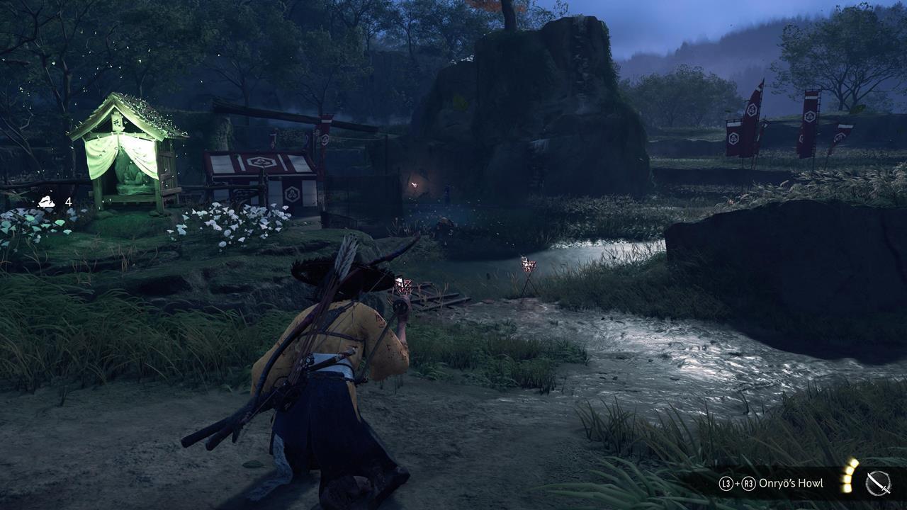 Следующая святыня стоит прямо посреди русла реки, так что пройти мимо почти невозможно 💧. Её охраняет NPC-ронин, жаждущий поединка. Проучите его Волчьим клинком — и сможете помолиться у алтаря.