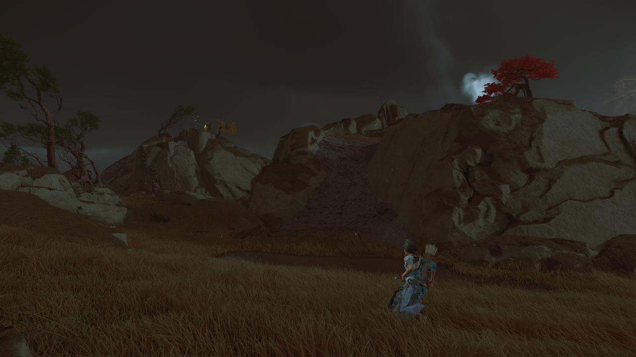 Эта святыня стоит на скалистом холме с видом на трактир «Алый журавль» 🏮. Это центральный хаб Тэсио, где расположены торговцы и дружественные NPC.