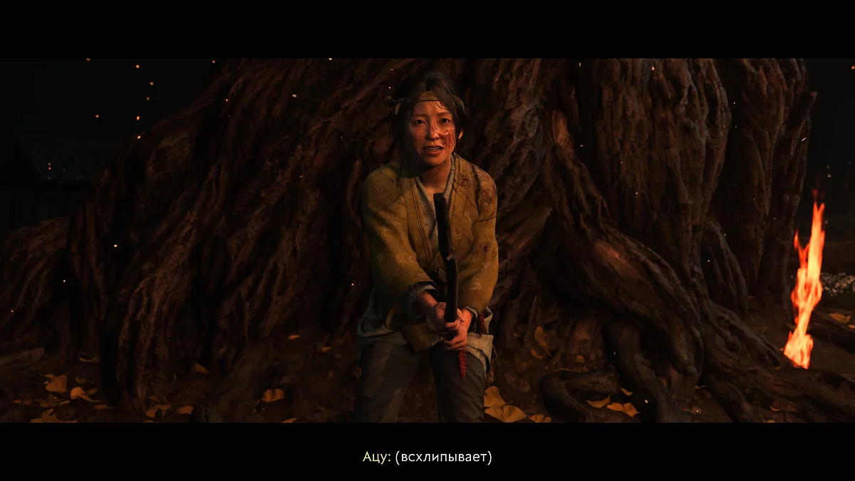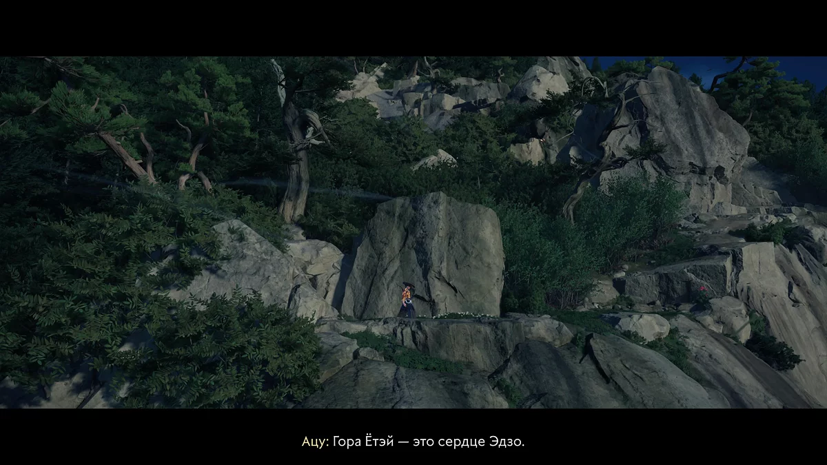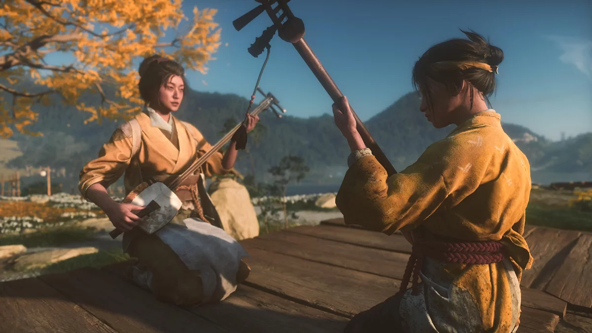 Чуть дальше откроется новая механика — игра на сямисэне. Подойдите к дому и поговорите с матерью Ацу. После заставки медленно водите пальцем по тачпаду и прислушивайтесь: когда индикатор на руке засияет, а звук станет громче, задержите палец на несколько секунд. Так нужно «поймать» несколько нот и выучить первый мотив. Позже эта функция пригодится для открытия полезных точек, призыва волка и перенастройки ветра к ближайшим святилищам.