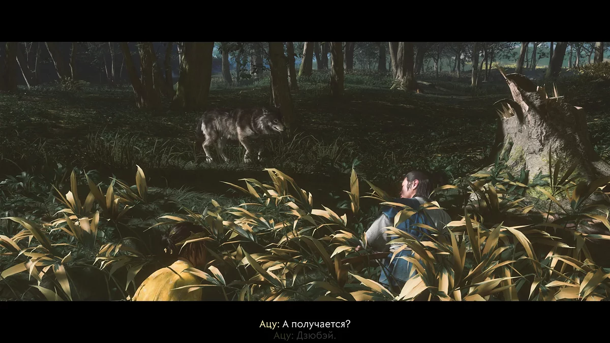Собрав грибы, следуйте за братом. Присядьте на R3 в высокой траве и подкрадитесь к волку. Запустится сцена — придет Сайто и спугнет зверя. Соберите еще немного грибов и возвращайтесь домой.