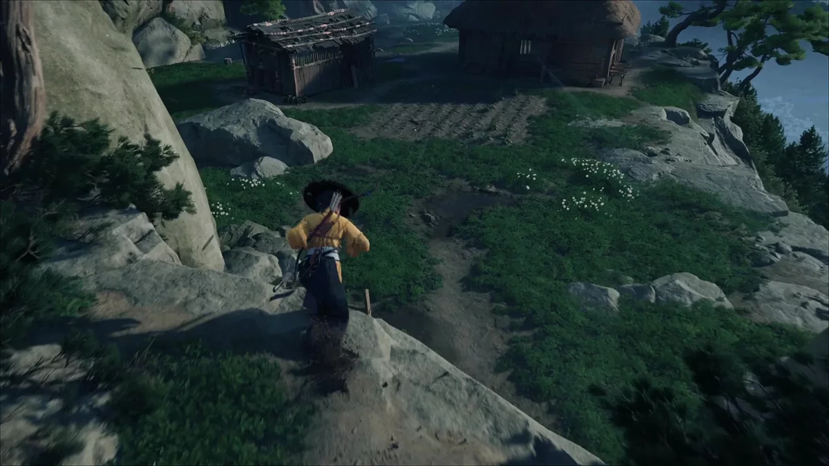Забрав лут, возвращайтесь на уступ и поднимайтесь выше. Прыгайте через прорези и пустоты. На вершине спрыгните и идите к дому. Не заходите сразу внутрь — сперва обойдите окрестности: соберите ресурсы, которые позже исчезнут, и осмотрите ориентиры, указывающие на местонахождение мастера двух мечей.