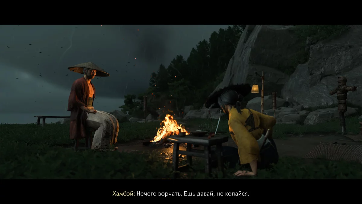 На углу дома найдется ящик с принадлежностями. Осмотрите огород и припасы для выживания. Затем входите в дом и изучите катану на подставке. Запустится кат-сцена — появится Ханбэй. Следуйте за ним к тропе и по пути подбирайте встречающиеся ресурсы — их много, пригодятся для апгрейда оружия.