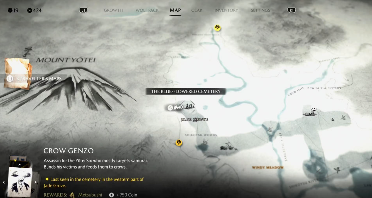 Плакат на розыск Гэндзо можно найти в Окрестностях Ётэй. После взятия направляйтесь к кладбищу с голубыми цветами в северной части Нефритовой рощи — это северо-запад Окрестностей Ётэй, выше леса Сикоцу. Гэндзо ожидает у центрального алтаря кладбища — это один из алтарей для размышлений.