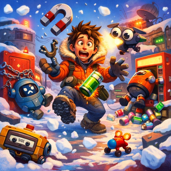 Добравшись до железнодорожных путей, припаркуйтесь и войдите на станцию, взломав замок. На кровати лежит аудиокассета, на столе — планшет с подсказками. Выпрыгните в окно и двигайтесь по белым стрелкам на контейнерах. По пути встретятся Самоделкины. Уперевшись в закрытую дверь, выпустите дрона на крышу и столкните балку. Подойдя к механизму, сперва зайдите направо — там верстак и расходники, затем возвращайтесь к установке.