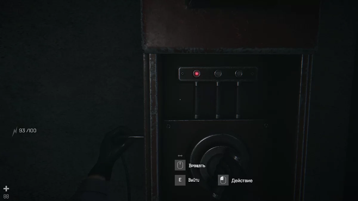 Чуть дальше по левой стороне увидите электрический щиток. Подключитесь к нему и активируйте механизм три раза. Крутите ручку и нажимайте ЛКМ, когда красный индикатор вспыхивает ярче. В шкафчике рядом — пищевые припасы. Поднимайтесь по лестнице и по пути возьмите еду с полки, а напротив — запасную батарею. Держась правой стены, зайдите в туалет: в раковине лежит рукоять лебёдки.