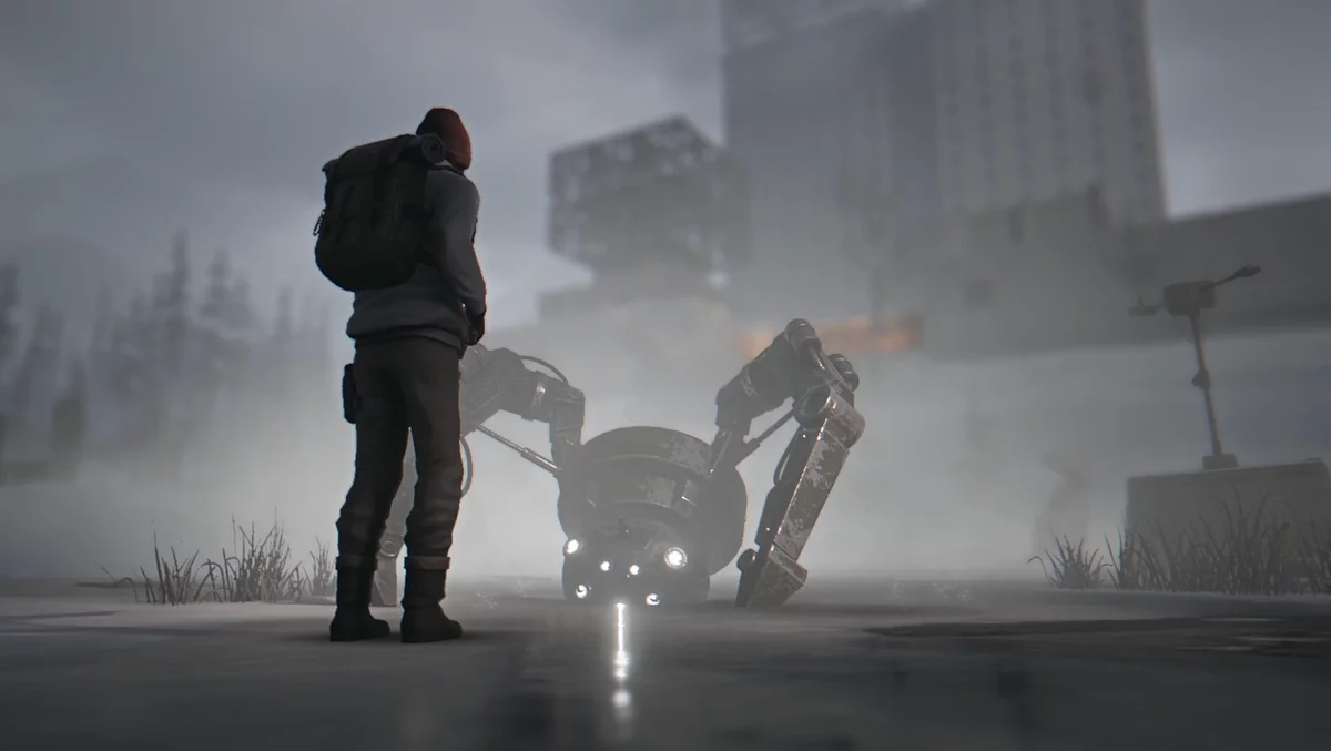 Припаркуйтесь у красного флага и следуйте по тропинке. Проползите под деревом — у пня будет развилка. Справа необязательная встреча с роботом, где можно получить достижения «По душам» и «Сувенир».