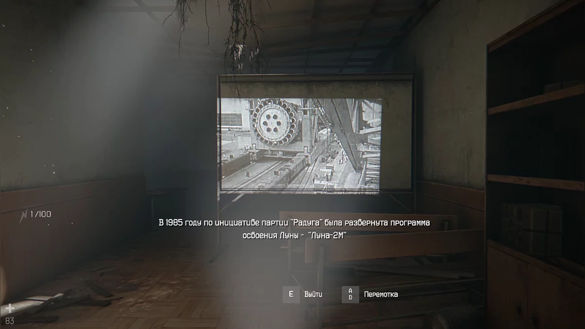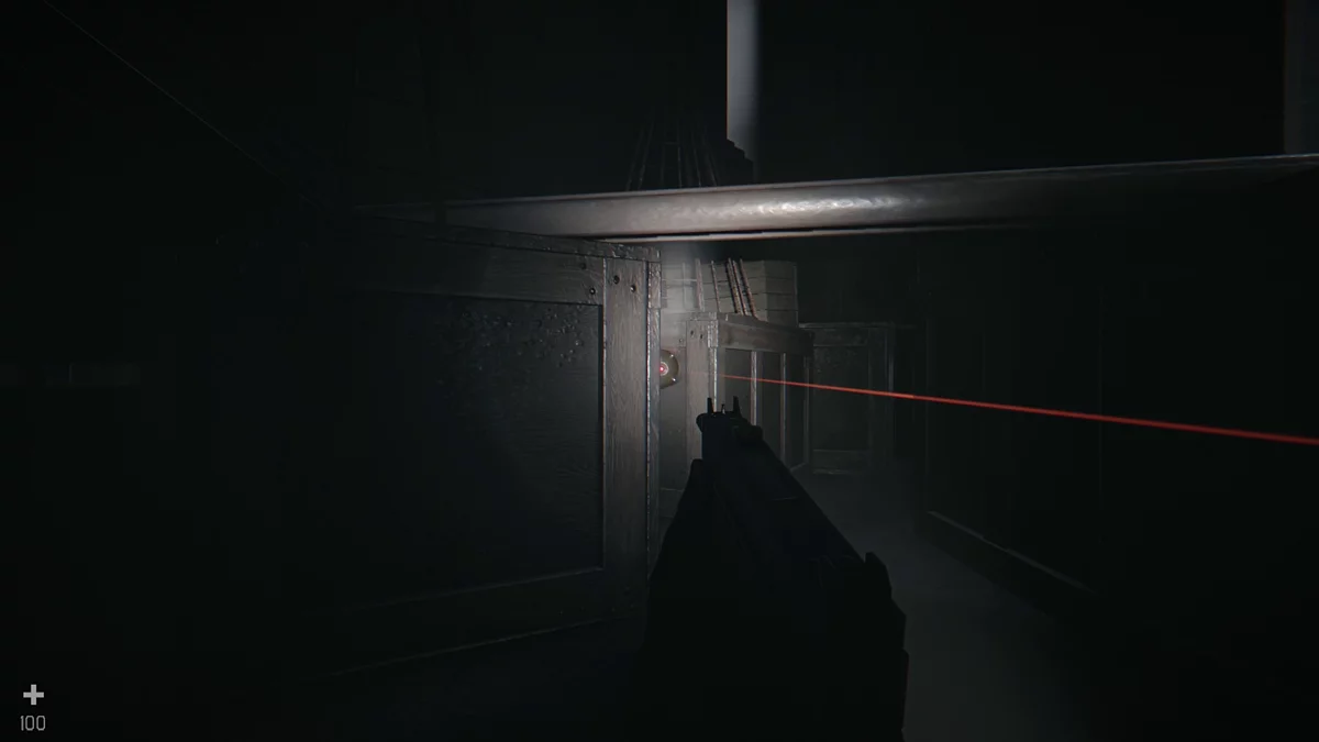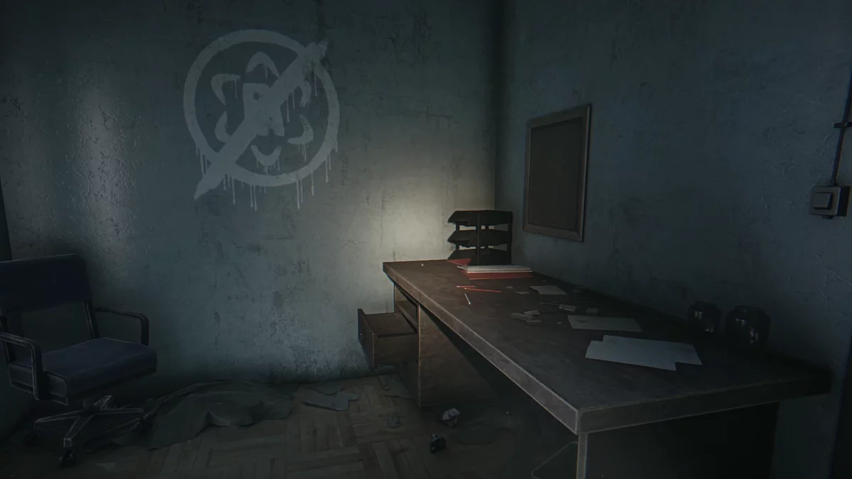 Чтобы распахнуть заклинившую дверь, возьмите слесарный ключ и нажмите клавишу действия. Затем ритмично ведите мышью вперёд-назад, пока деревянная планка не треснет. Поднимитесь на второй этаж и войдите в небольшую комнату с проектором. Включите его, чтобы получить достижение «Просвещение» и узнать код для красного сейфа.