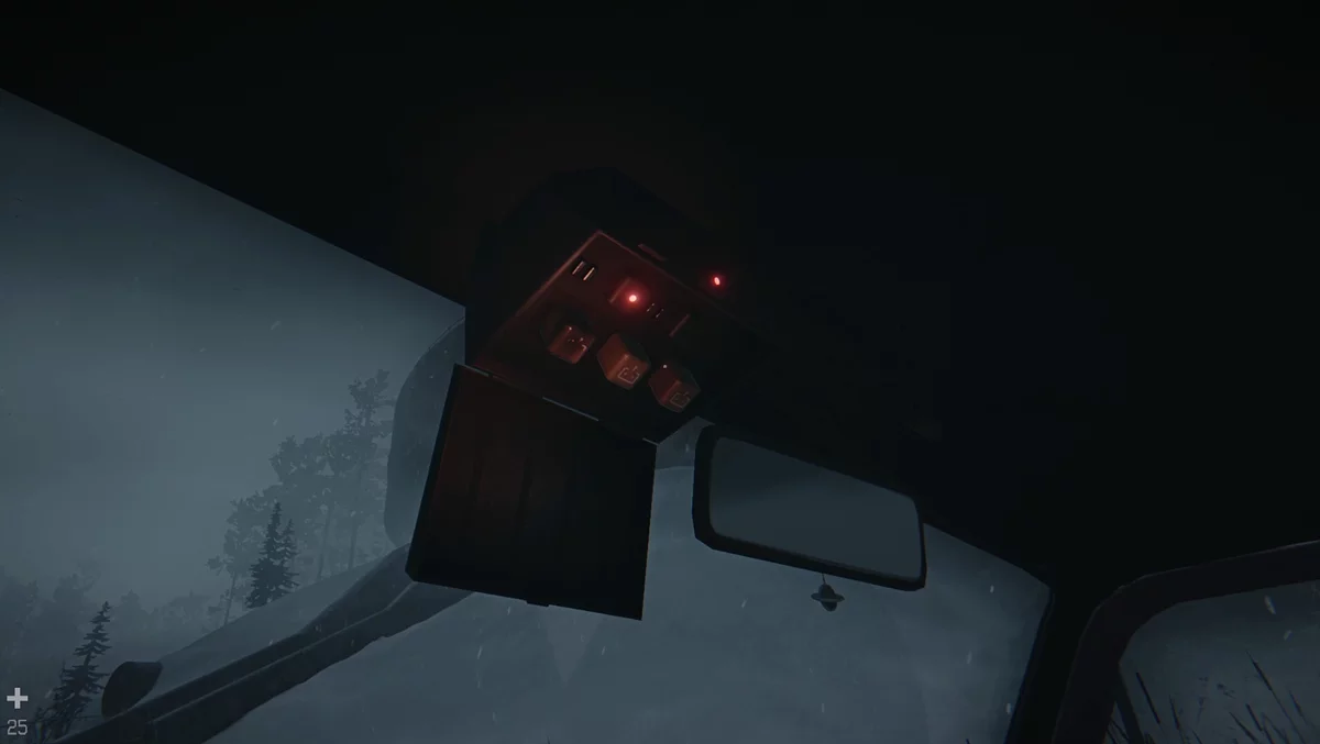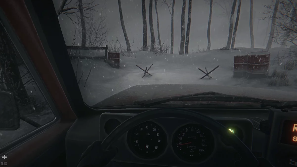 Опустите капот и подойдите к правому заднему колесу. Поставьте его и затяните болты, затем уберите домкрат справа от колеса. После этого садитесь за руль. Справа — красный тумблер, он активируется на третье нажатие. Включите первую передачу и выезжайте из гаража к указателям. От перекрестка держитесь правой стороны. Поднимитесь по лестнице и припаркуйте авто у шлагбаума. Дальше путь пешком. Доберитесь до ближайшей красной машины, распахните дверь и заберите навигатор у руля. В сторожке рядом — батарея. Возвращайтесь в бункер.