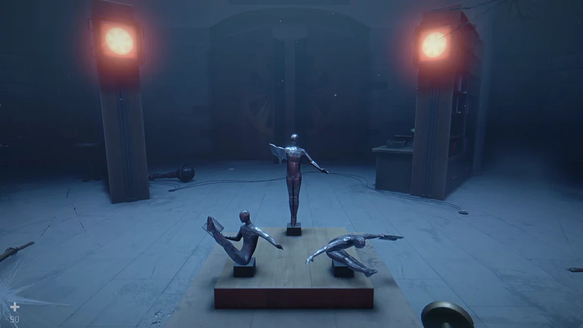 В затемнённом коридоре будут две комнаты. В одной стоит закрытая коробка, которую пока открыть нельзя. Во второй — красный сейф. Комбинацию «1-9-8-5» вы узнаете позже, когда восстановите подачу электричества и включите проектор на втором этаже музея. Внутри лежит железная монета — пригодится позже.