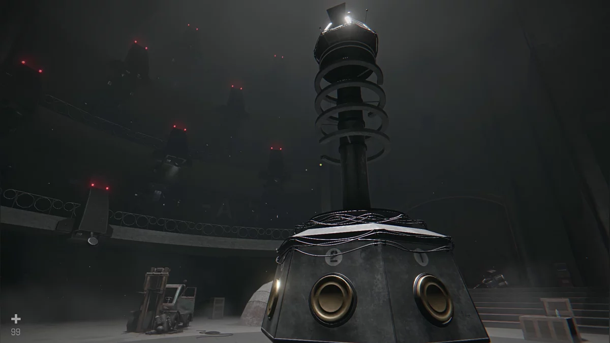В центре зала установлен механизм с нотами. Чтобы его активировать, нужна верная последовательность. Записка с кодом спрятана в одном из контейнеров и появится после нескольких неверных попыток. Сразу можно ввести правильную комбинацию «1-2-4-6-4-5-3-7-2».