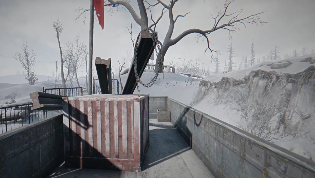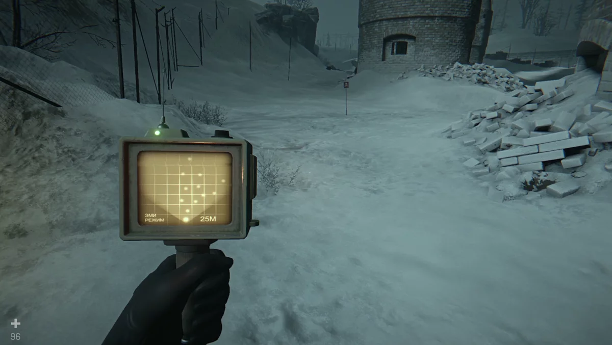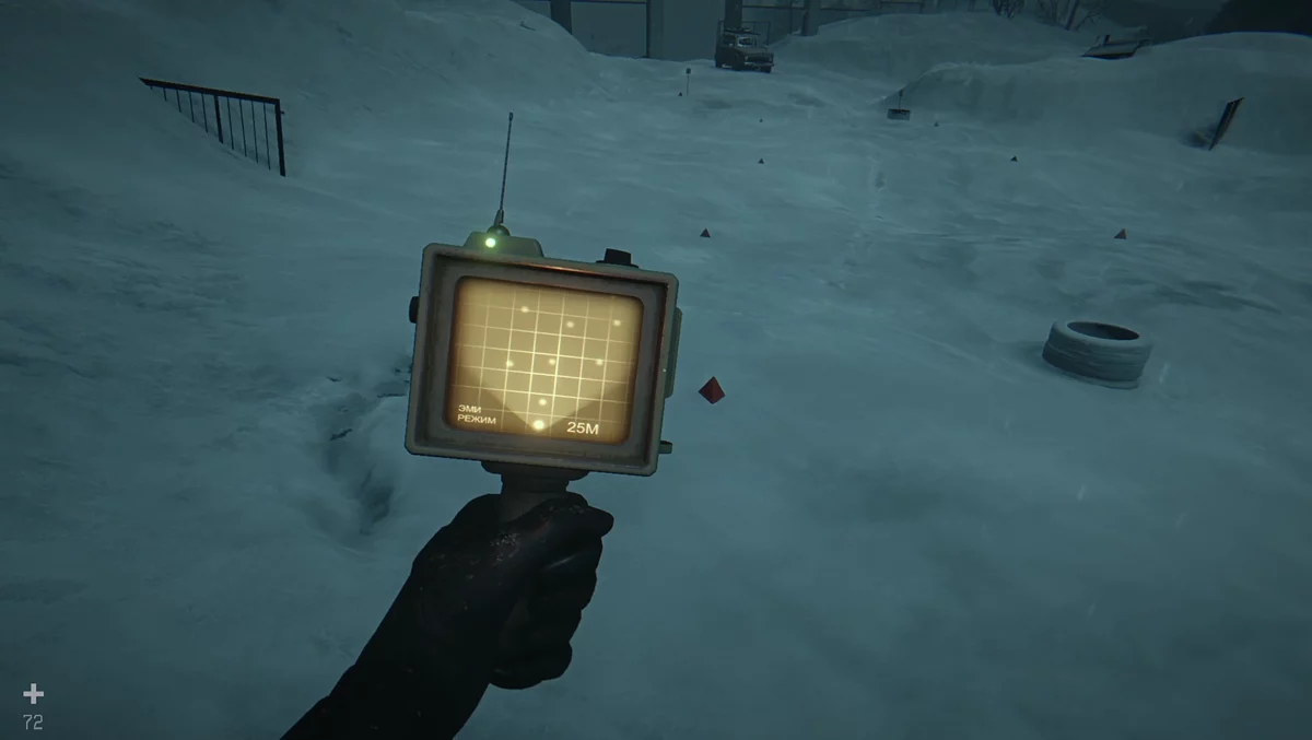 Езжайте к стадиону «Восход». Вся арена заминирована, но проезжать нужно на машине. Слева у лестницы стоит красная металлическая пирамидка; ещё несколько можно столкнуть с ящика дроном. Эти пирамидки притягиваются к мине и помечают её, если бросить рядом. Держать в руке одновременно детектор и предмет можно — это упрощает отметку. Пирамидок ограничено, поэтому либо планируйте маршрут, либо половину пути придётся выходить и проверять дорогу вручную. Снег быстро заметает следы.