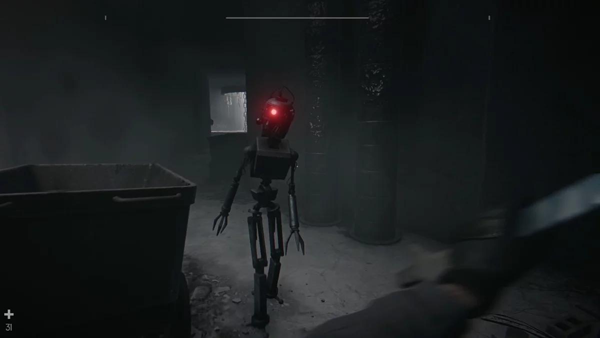 Чтобы попасть в дом, воспользуйтесь импровизированной лестницей слева от входа — попадёте через окно на второй этаж. Спуститесь и по другой лестнице поднимитесь на третий. В квартире с отметкой «Х» находится верстак и металлический ключ от лифта. Вернитесь на первый этаж и откройте шахту лифта. Вставьте переходник для ключа, активируйте механизм и быстро выберитесь. На вас нападут несколько роботов; у самого крупного сверху отображается здоровье.