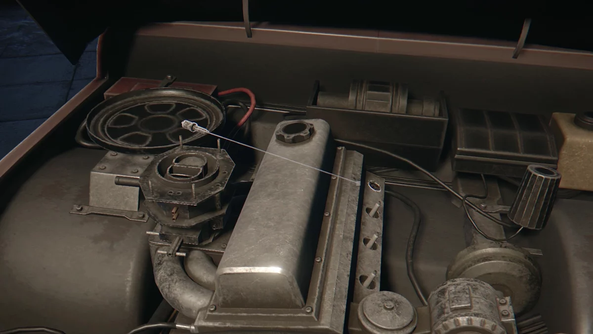 Лёд на воротах разбивается слесарным ключом. Заходите в гараж и включите свет, опустив рубильник на стене. Осмотрите список задач на рабочем столе и приступайте к починке. Подойдите к капоту и взаимодействуйте с двигателем. Слева, в глубине, появятся детали, которые нужно смонтировать. Крупный блок установите на круглую платформу слева. Четыре свечи зажигания вставьте справа в небольшие гнёзда.