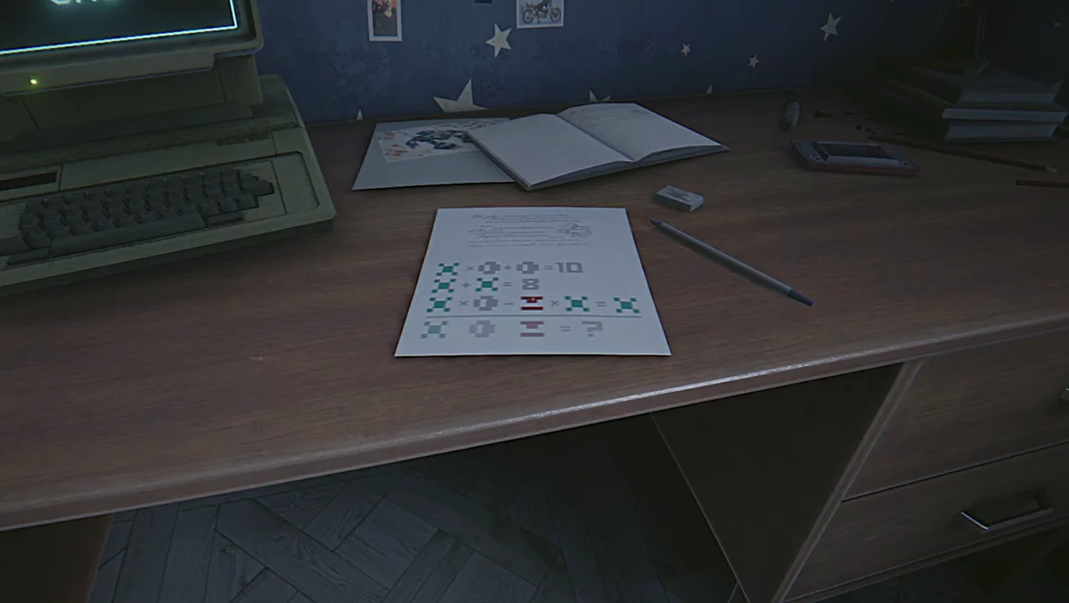 Новый сон Игната. Вы очнётесь в детской; на столе лежит листок с математической задачей. Ответ «4-2-1» — код к входной двери. Выйдя, спускайтесь на этаж ниже и войдите в приоткрытую комнату. За вами начнёт охотиться робот, реагирующий на свет и шум.