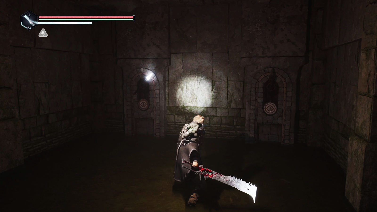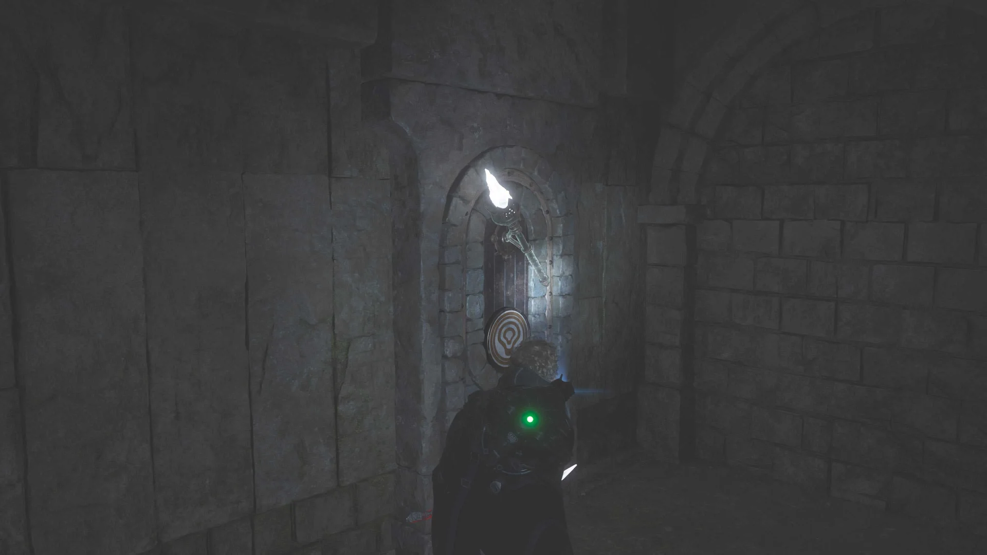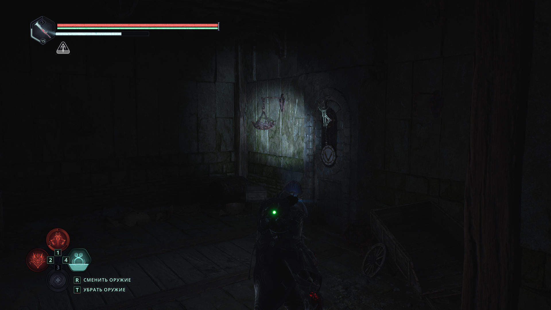 Устранив угрозу, вы сможете осмотреться и заметить пару факелов на стене.