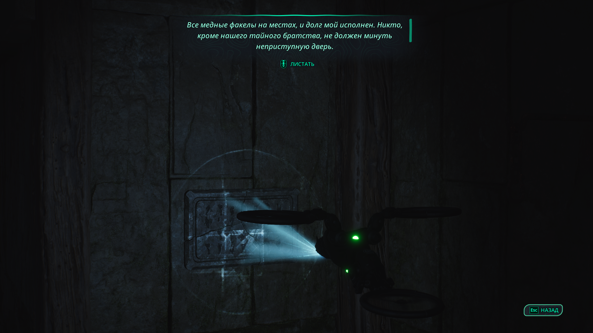 Главное, перед уходом не забудьте дернуть факелы с буквой V в соседней комнате. Как написано в блокноте, в этом случае повернуть нужно оба.