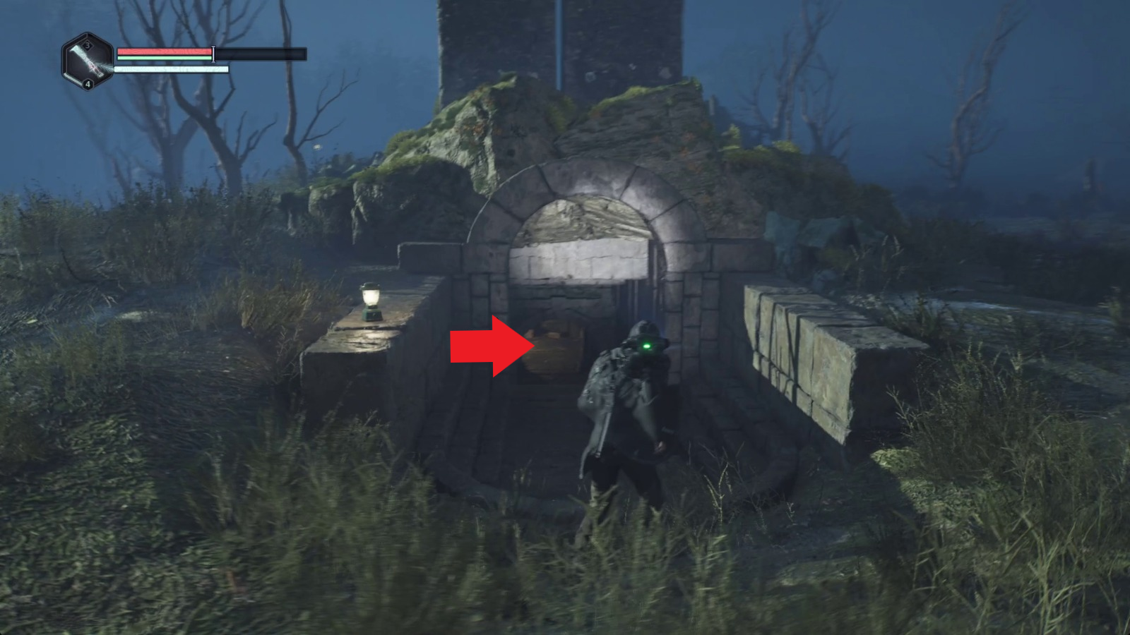 Помимо раненых солдат и лимбического сундука, вы найдете здесь факелы с лампочками. Дернуть нужно левый, который обведен сплошной линией.