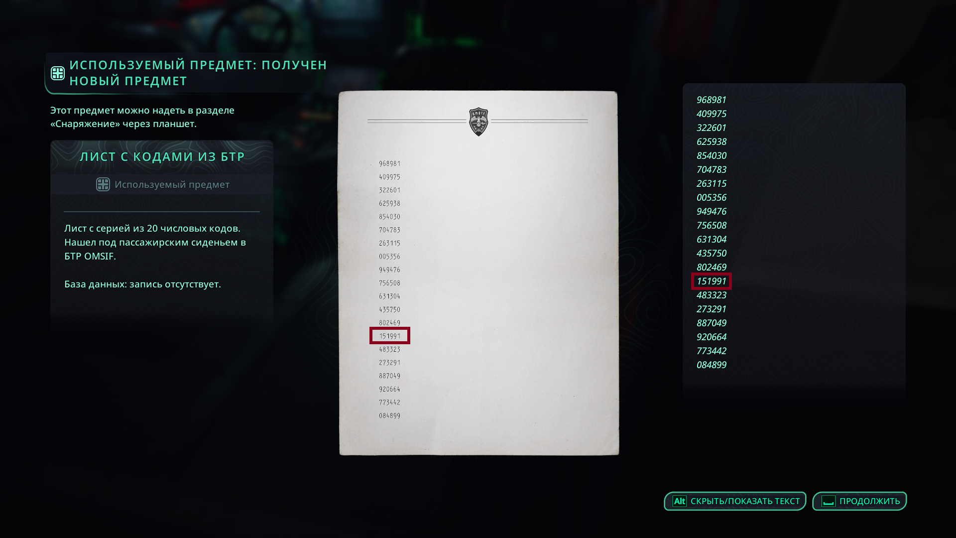 Из этого разговора выяснится, что под пассажирским сидением в БТРе все это время была спрятана записка с какими-то числами. Ваша собеседница подскажет, что там перечислен список временных кодов от базы OMSIF на болотах Акаса, и сейчас актуален 14-ый.