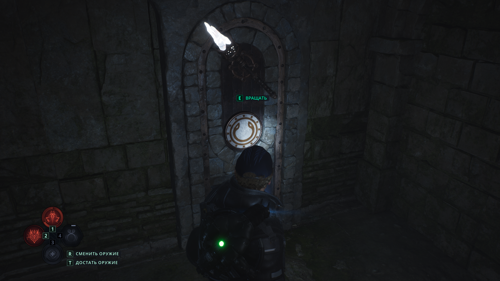 Кроме ценных трофеев, справа от двери в сокровищницу вы обнаружите тот самый факел с U-образной фигурой. Как и сказано в блокноте, повернуть нужно именно тот, что отмечен пунктиром, то есть левый.