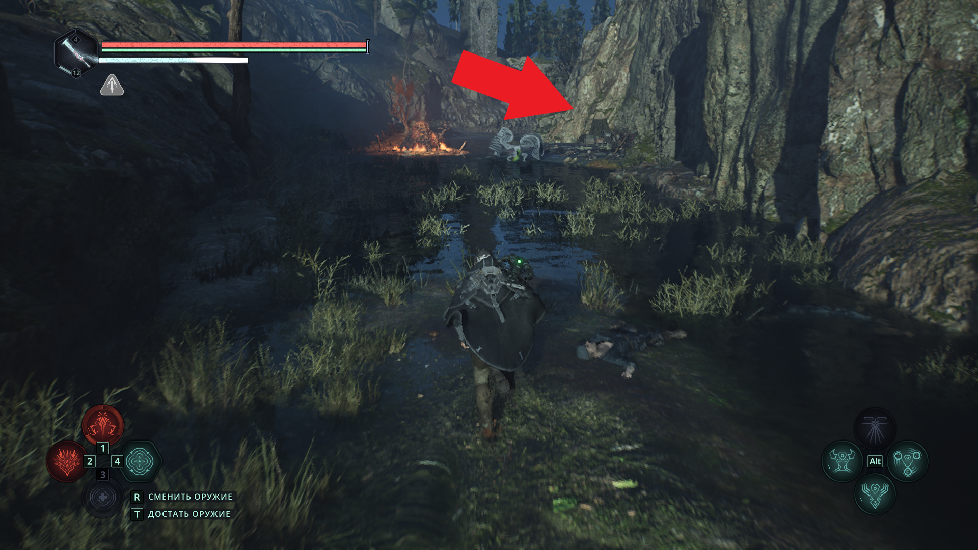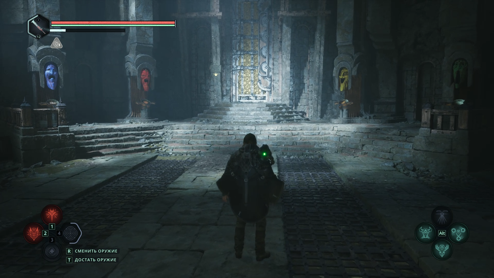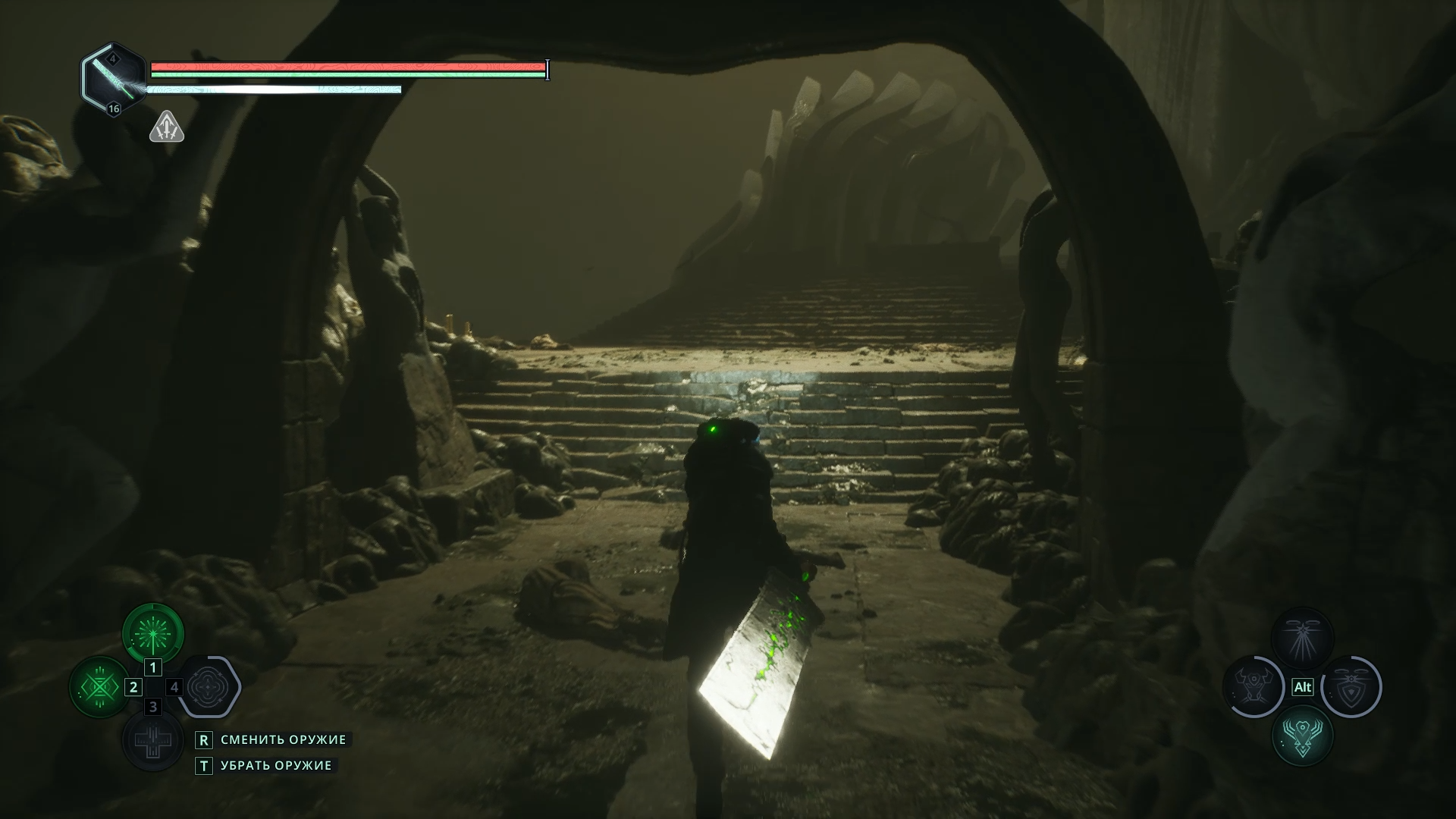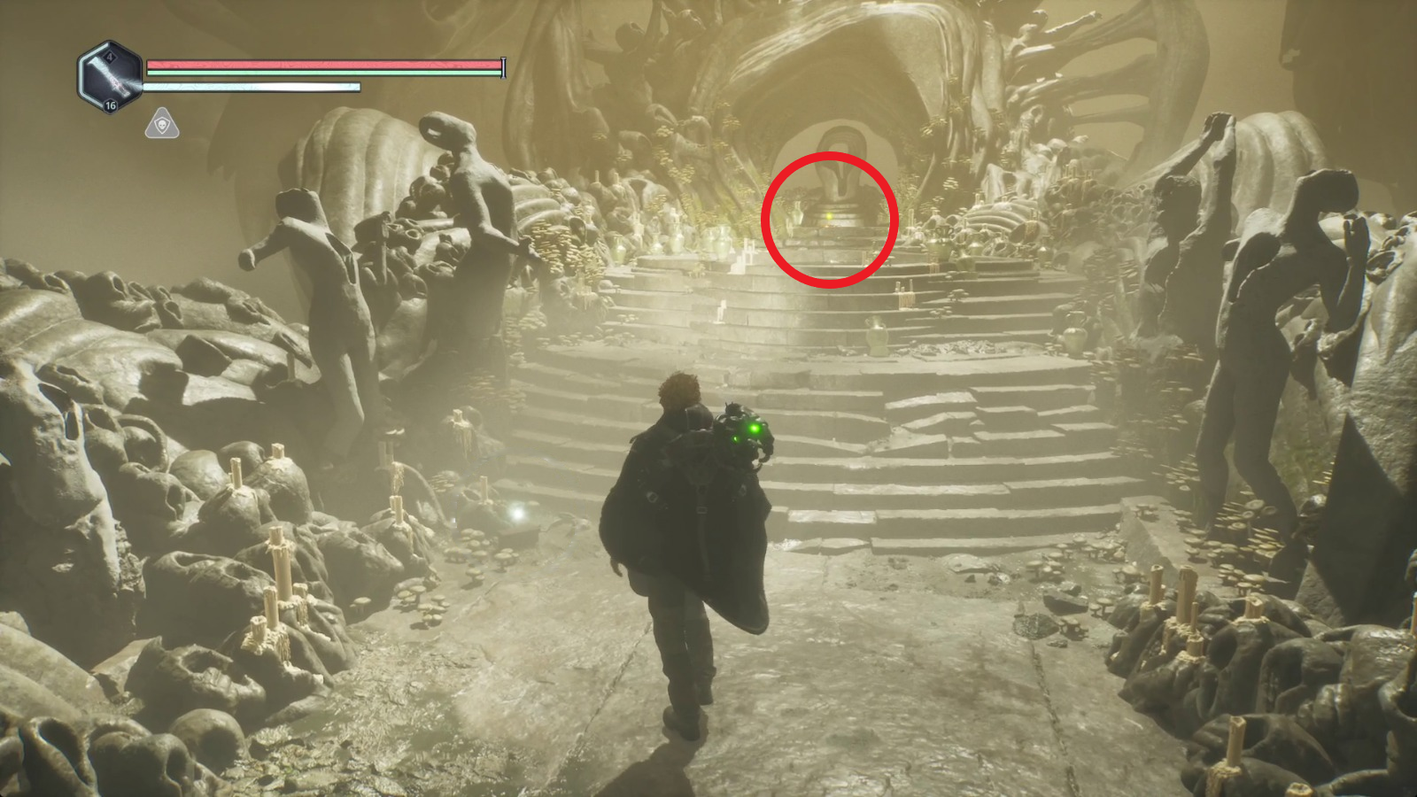 Перед тем как навсегда покинуть Храм павших, можно сделать еще одно дело 📝 Спуститесь по длинной лестнице от алтаря — она выведет вас обратно ко входу.