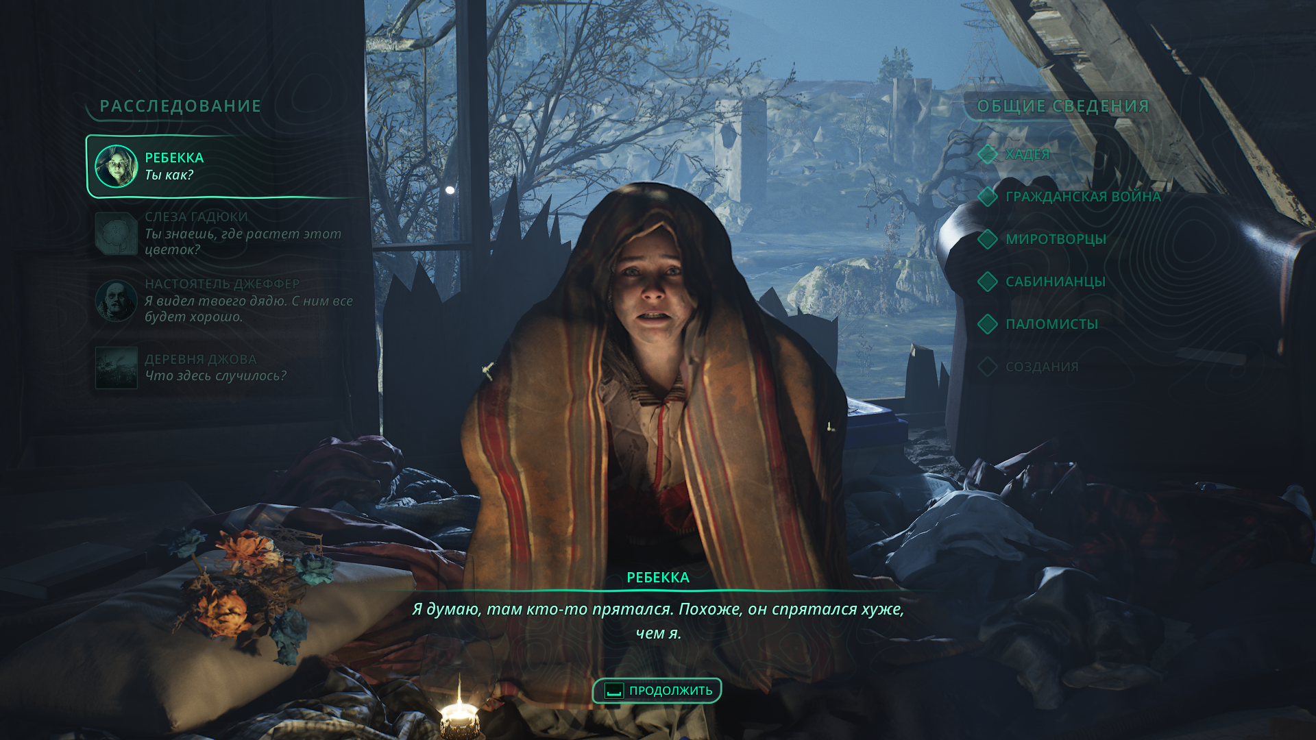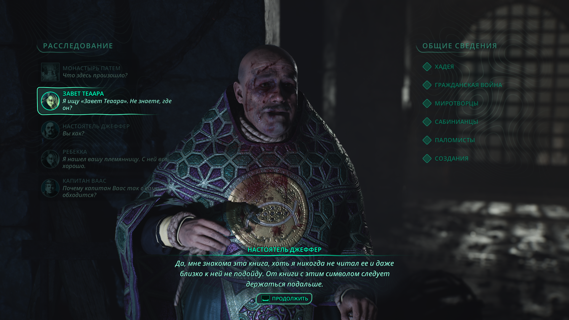 Если такой реплики в диалоге нет, вероятно, вы ранее не поговорили с племянницей настоятеля Ребеккой 👧, которая прячется на чердаке возле домика на дереве в Джове.