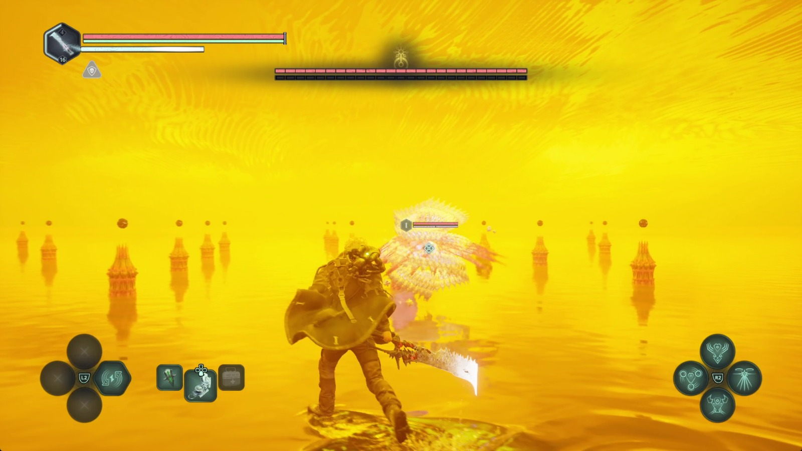 Потянув за рычаг, вы откроете дверь, за которой находится главный алтарь Храма павших ⛩️ — на нем что-то лежит. Хотелось бы, чтобы это был ключ-камень счастья, но, подняв сферу, вы переместитесь в иное измерение 🌌, где уже неизбежно начнется бой. Причем он сильно отличается от всего, с чем вы сталкивались ранее.