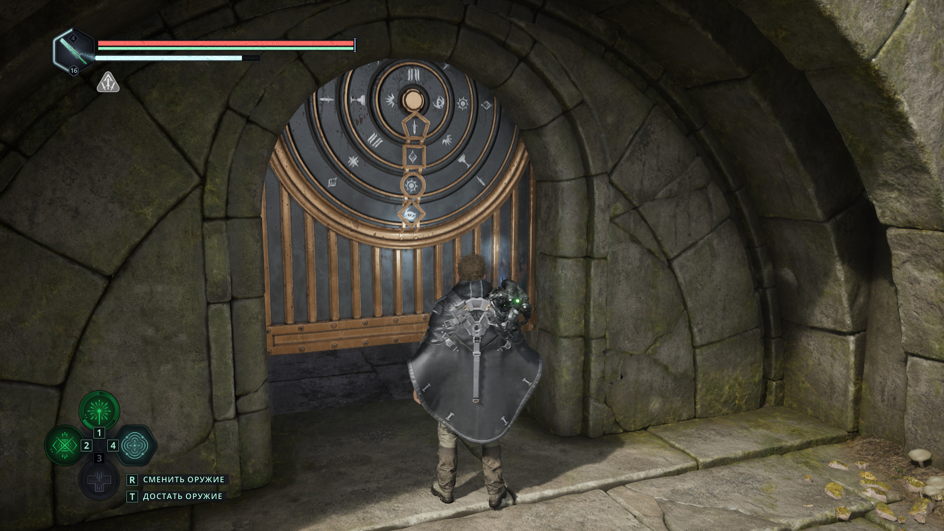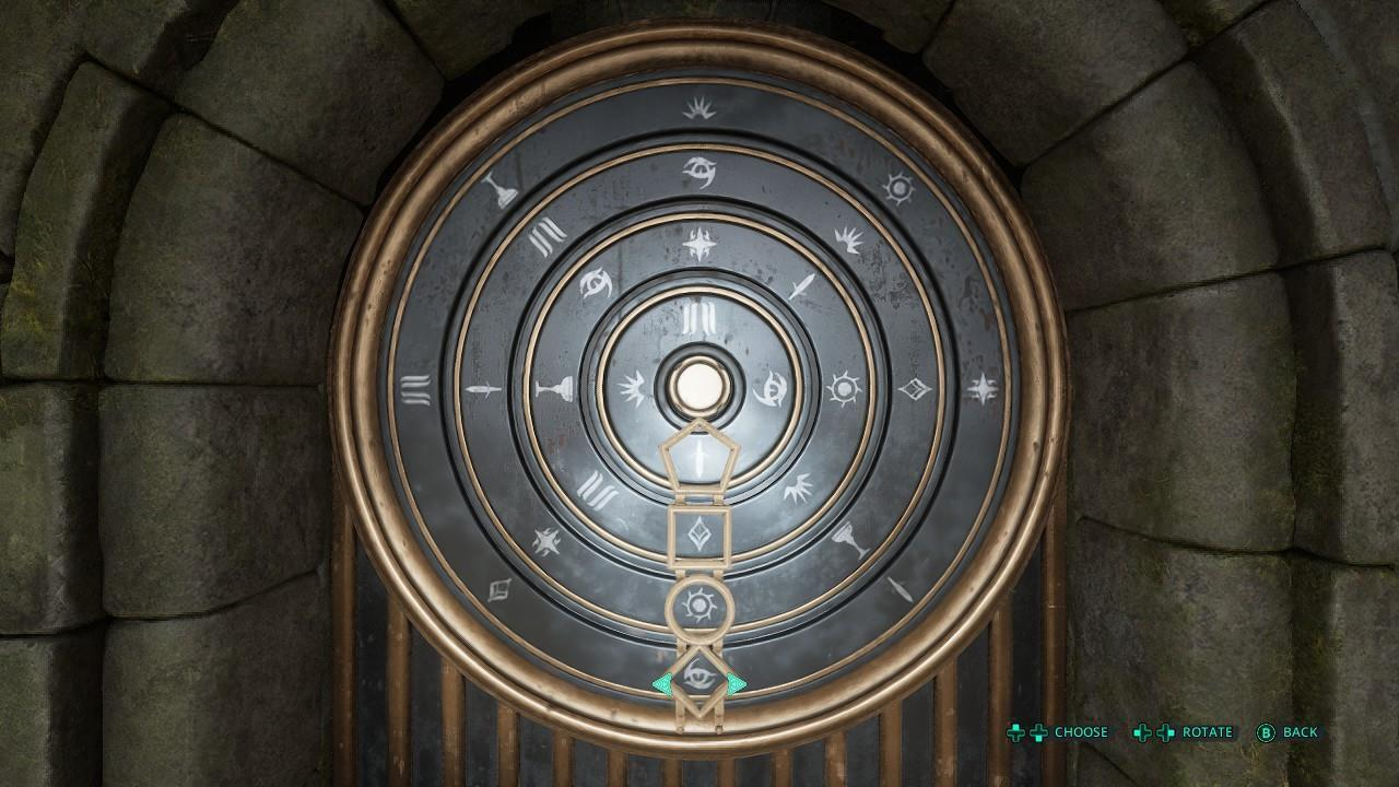 Добравшись до Туманных равнин, идите прямо, пока на вершине лестницы не упретесь в тупик. Вставьте тот самый символ двуглавого змея 🐍 в гнездо в стене, чтобы открыть потайную дверь. На механизме двери выставьте символы в комбинации, как на скриншоте ниже.