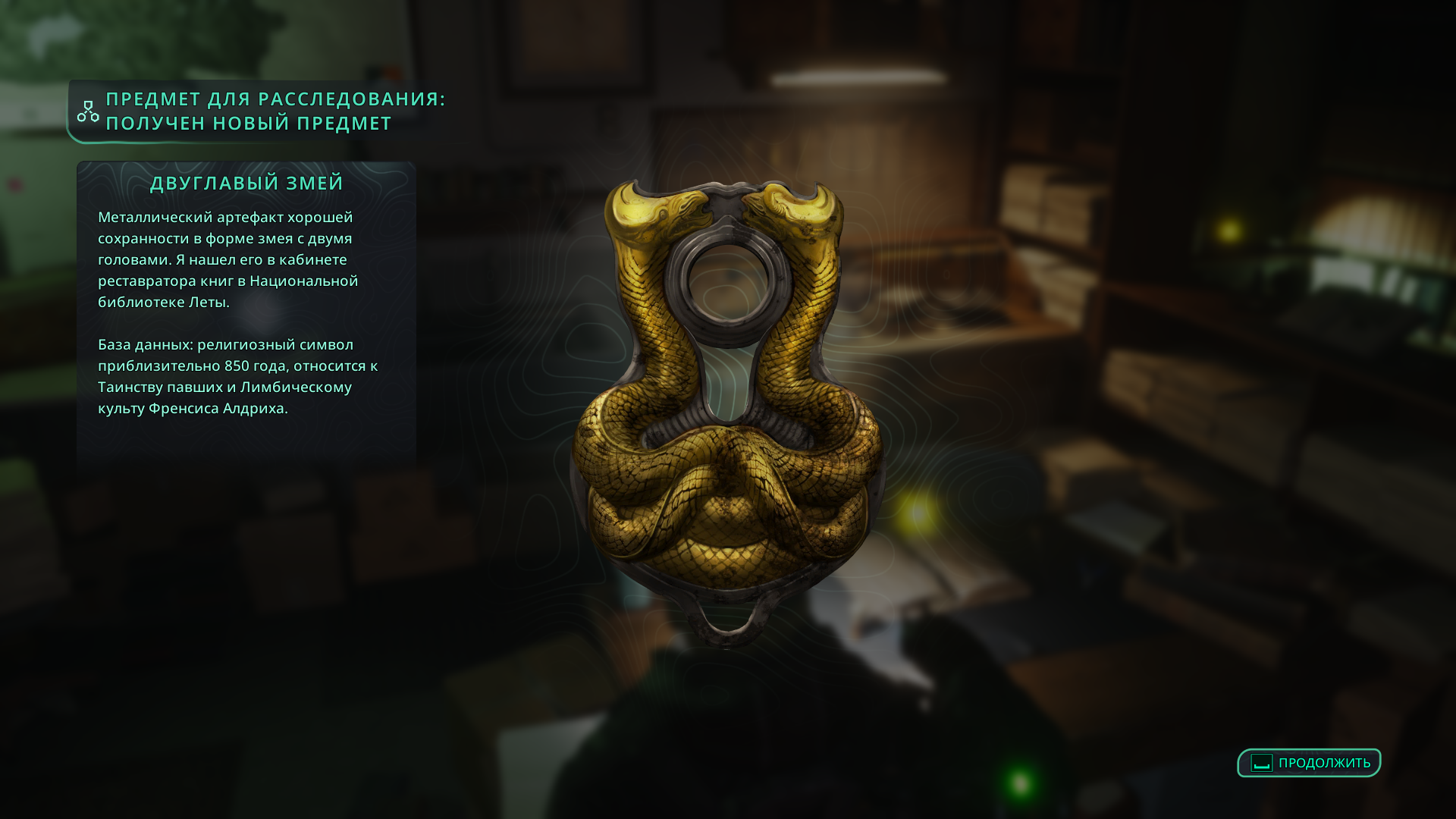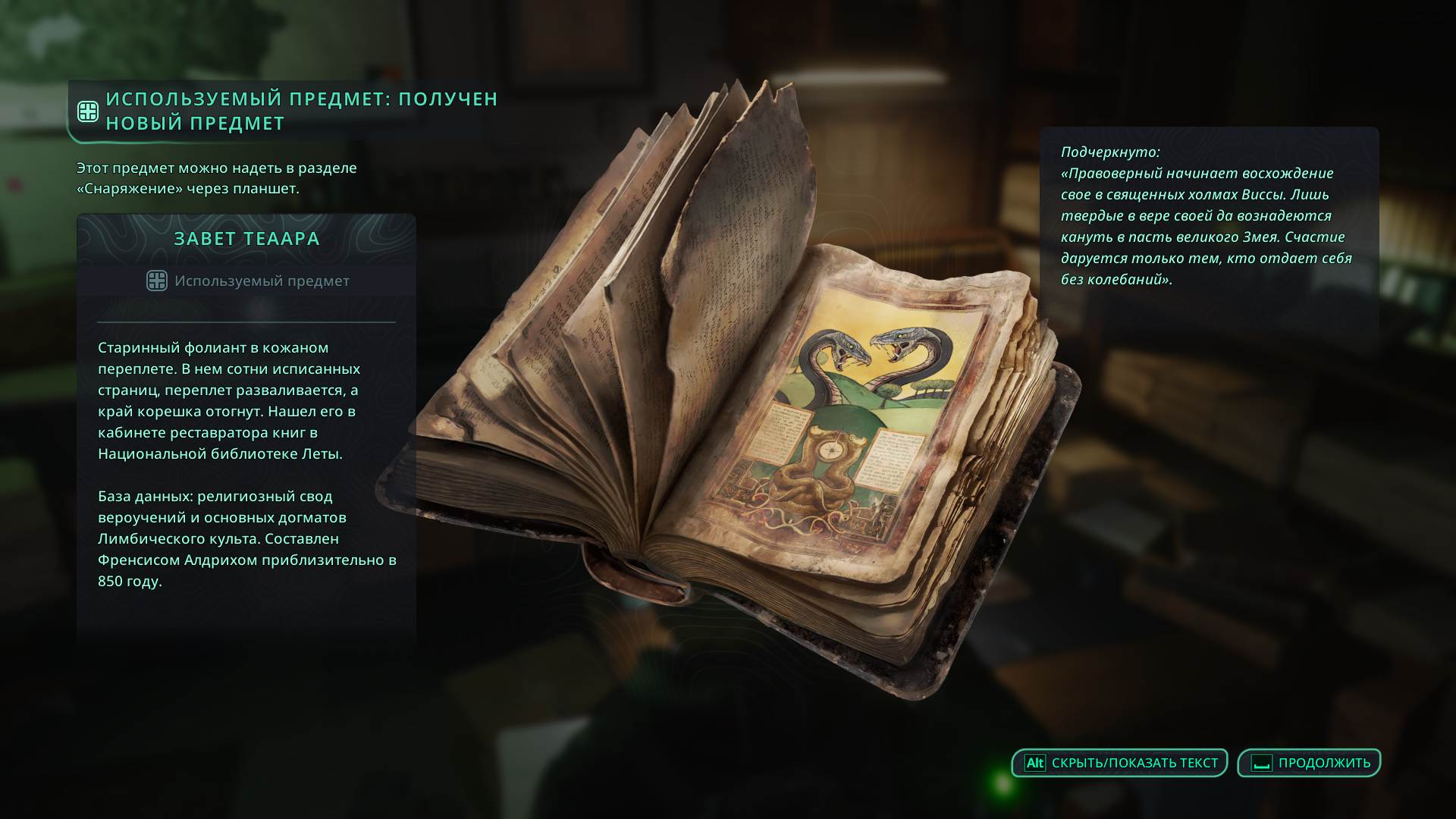 От него вы узнаете о книге «Завет Теарра» 📖, хранящейся в Национальной библиотеке Леты. В ней собраны древние оккультные знания и прочие сведения, включая упоминание символа двуглавого змея.