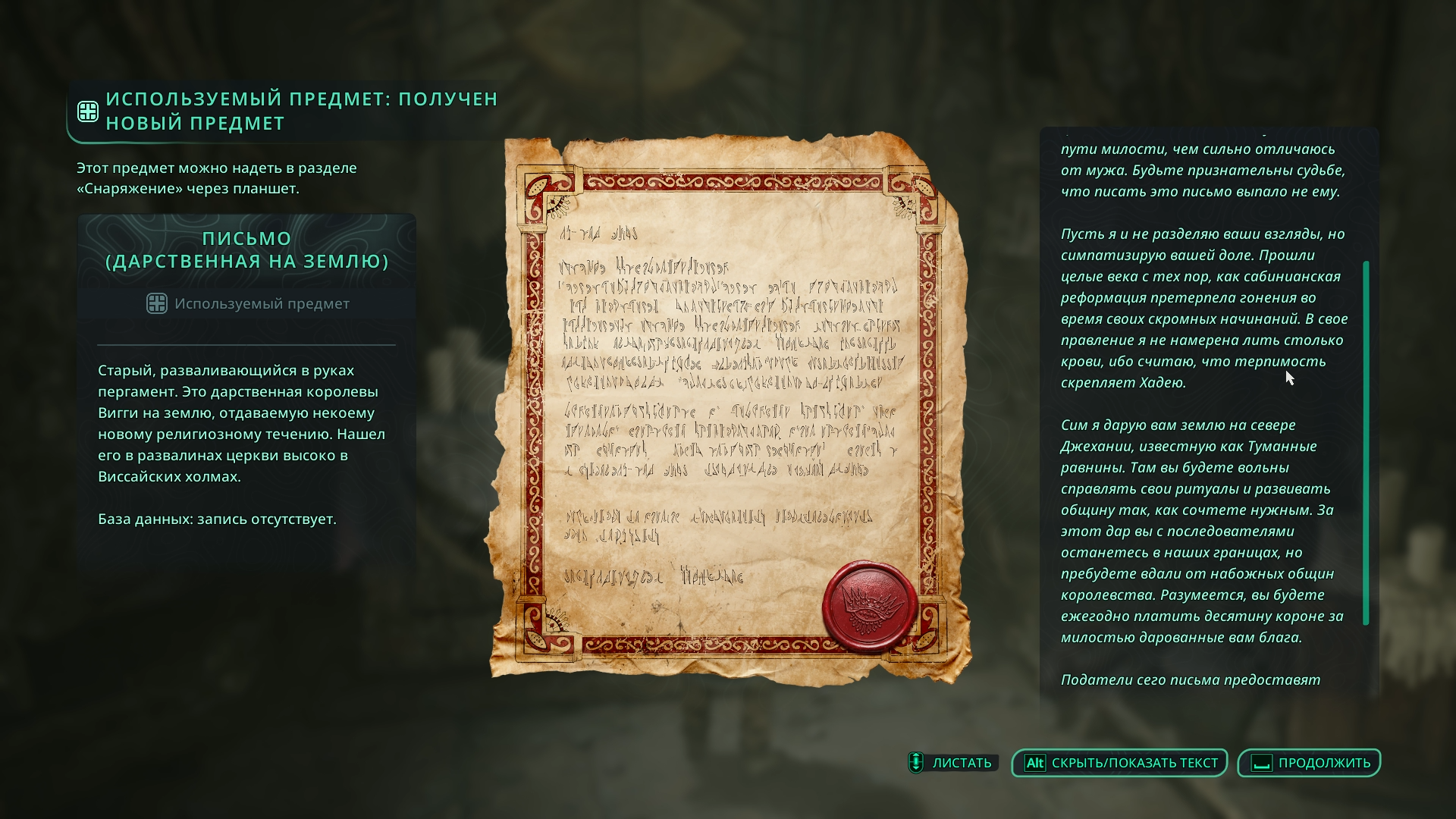 Это дарственная на землю 📜, из которой вы узнаете о следующей точке поиска ключ-камня счастья — Туманных равнинах.