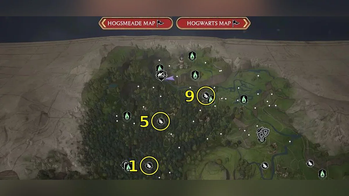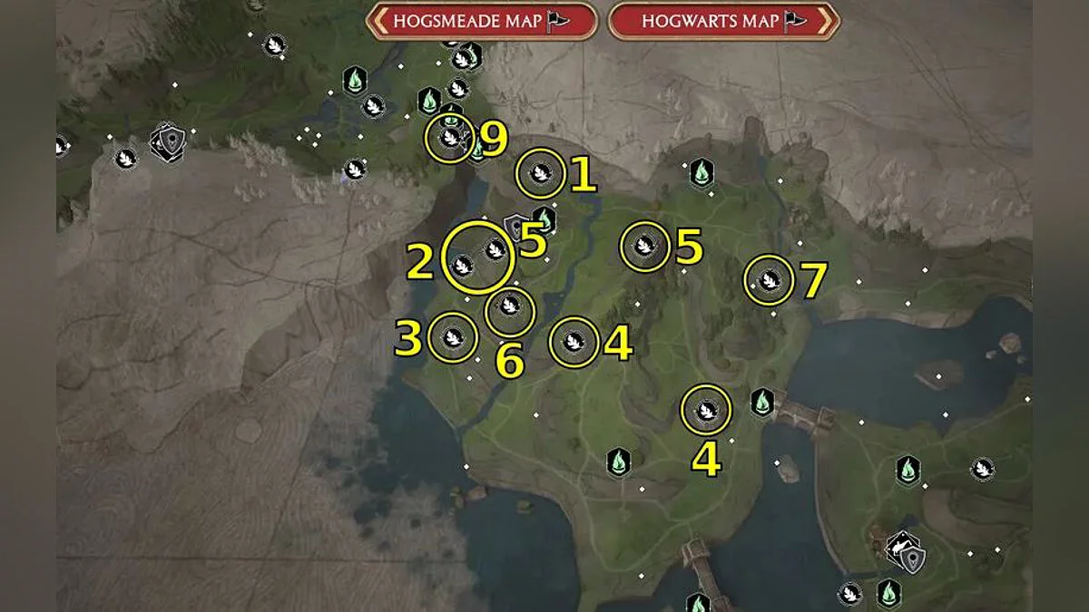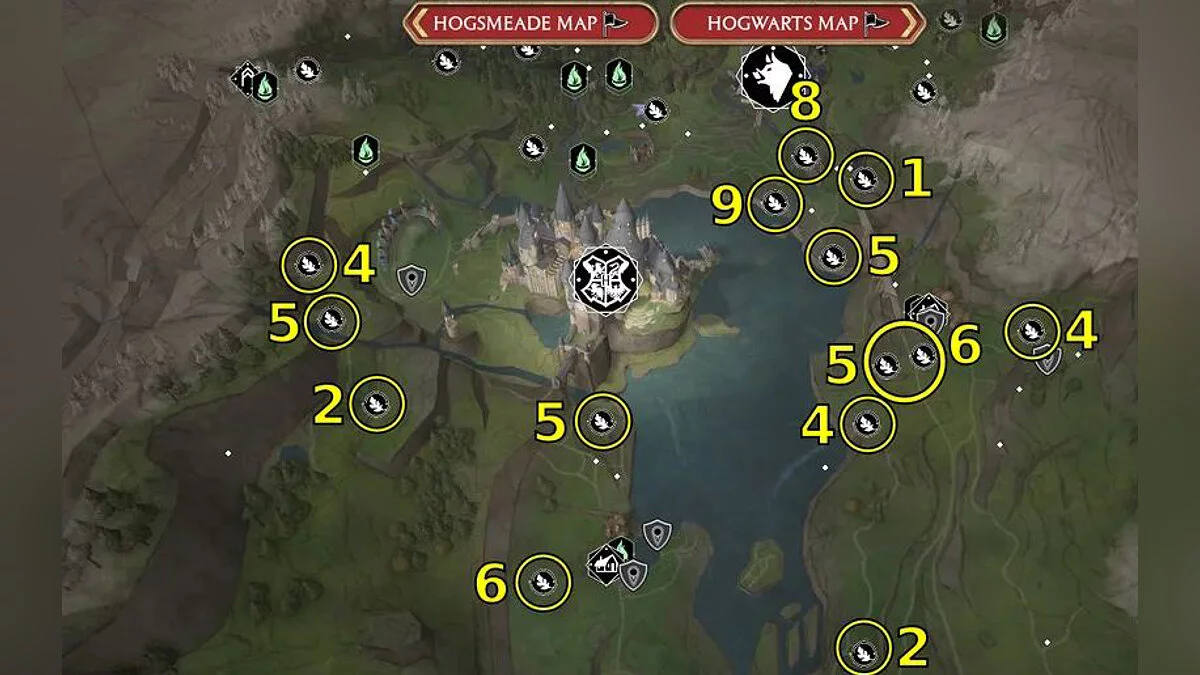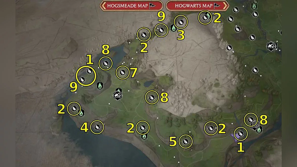 Ориентируйтесь по картам ниже, чтобы найти все 95 испытаний Мерлина в Hogwarts Legacy. Номер на карте соответствует типу головоломки.