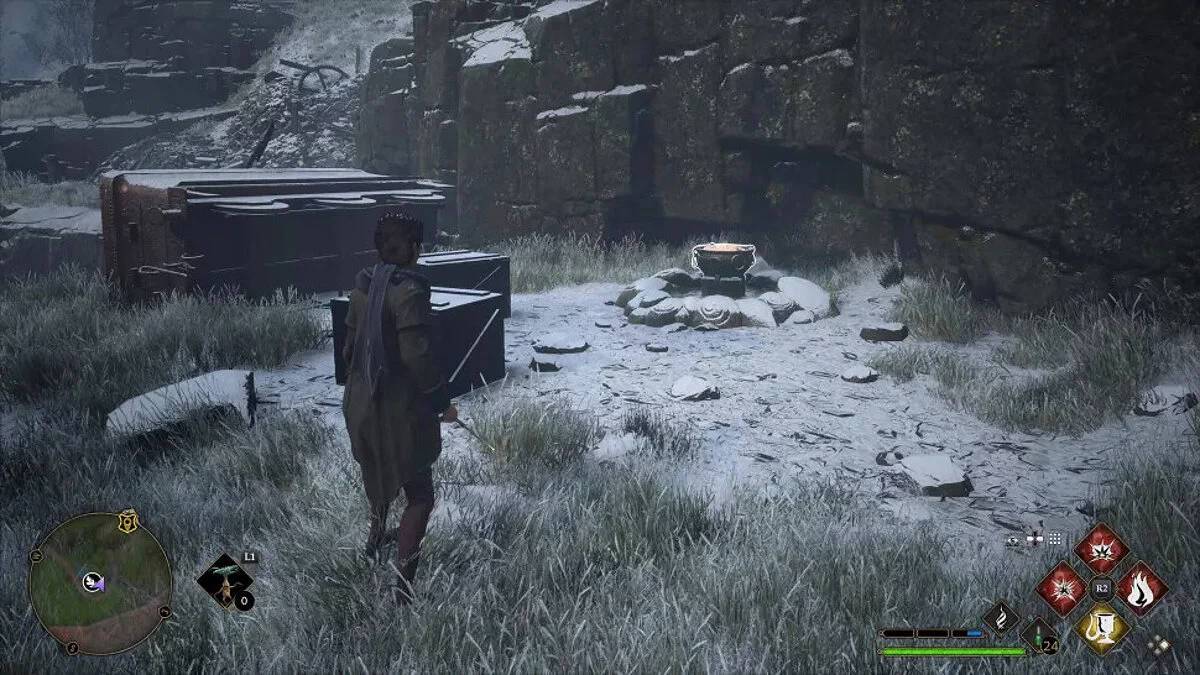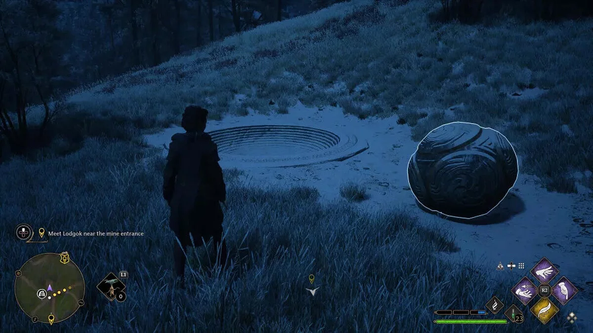 Здесь вы найдёте каменные плиты с четырьмя круглыми гнёздами, а поблизости — небольшие каменные шары. Используйте Акцио, чтобы подтянуть шары и разместить их на всех плитах.