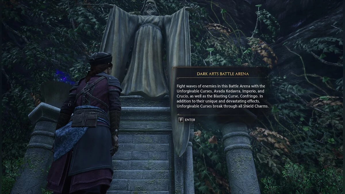 Боевая арена темных искусств доступна только для владельцев предзаказа, включающего DLC «Dark Arts Pack». Она не требуется для получения достижения. Здесь вы можете использовать все три непростительных заклятия: Авада Кедавра, Империо и Круцио, а также взрывающее заклинание Конфринго. В дополнение к уникальным и разрушительным эффектам, непростительные заклятия пробивают все Защитные чары. Вход расположен в Запретном лесу (Forbidden Forest).