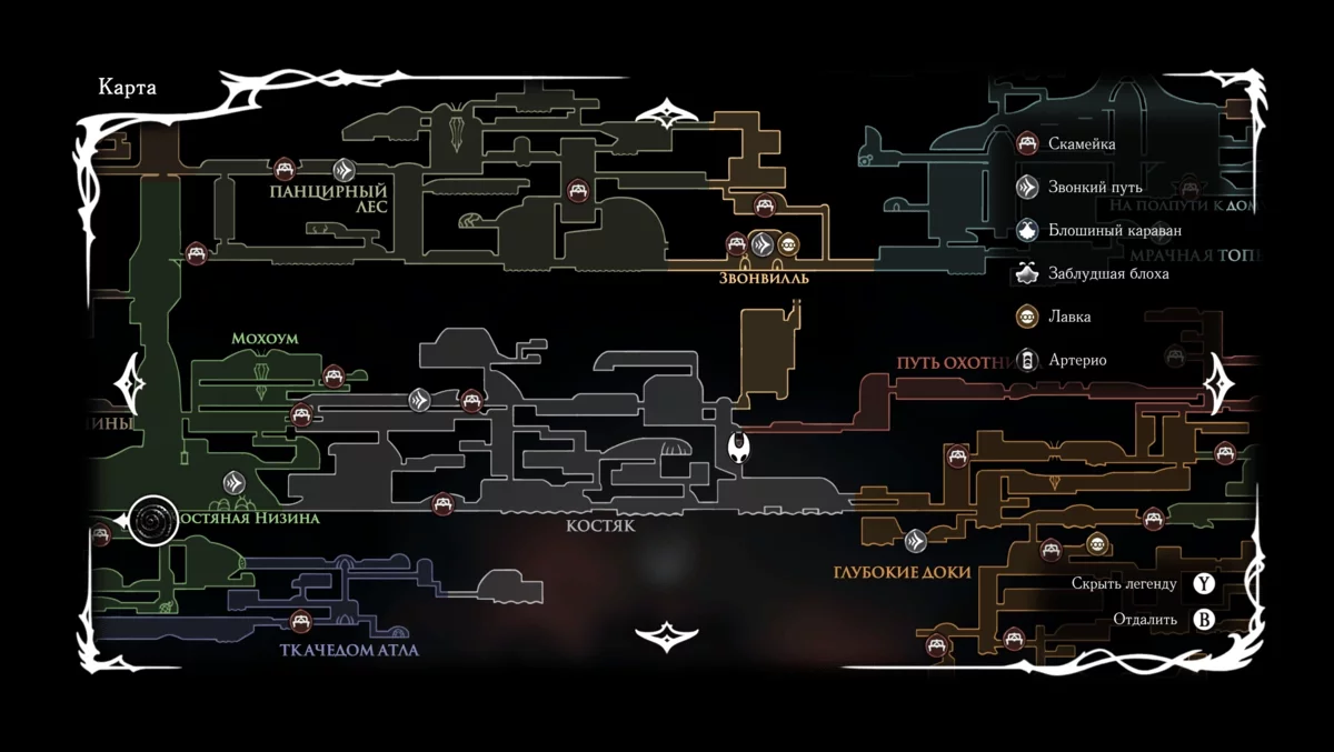 Победив Колокольного зверя в локации «Костяк», двигайтесь вправо, пока не дойдёте до входа в «Путь охотника». Не переходите в новую зону и спускайтесь ниже до двери со знаком в виде круга с решёткой. Внутри вы обнаружите лавочку и Гриндла, заключённого в клетке. Чтобы освободить его, сломайте решётку иглой. После беседы не забудьте забрать из камеры инструмент «Прямая булавка».