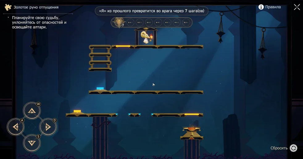 Здесь упор на многоуровневую платформу и контроль позиций. Сделайте шаг на 1 доступную секцию, но задержитесь у лестницы. На шестом ходу встаньте на жёлтый переключатель — это заставит вашего двойника соскользнуть на средний ярус к синей кнопке, а затем — на нижний уровень. Пока он занят, пробирайтесь к финальной клетке и сразу запрыгивайте на алтарь.