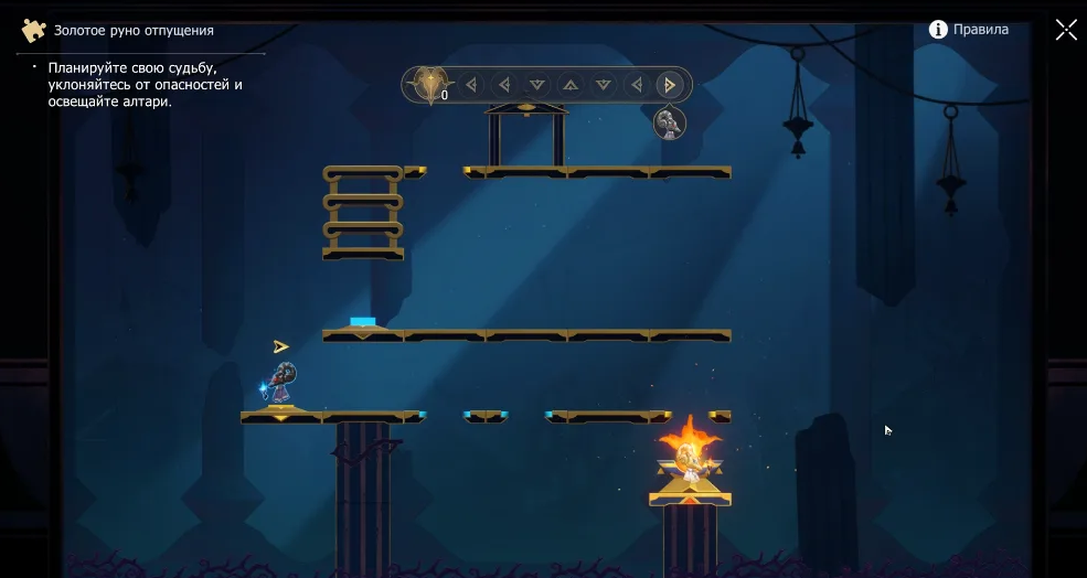 Когда двойник остановится, возьмите пламя и перенесите его к алтарю. Решающим остаётся тайминг: выполните 4 шага влево, затем трижды повторите последовательность «один вправо, один вверх, один влево», и завершите двумя шагами вправо. Не спешите: следите за циклом — и пламя окажется в чаше без помех.