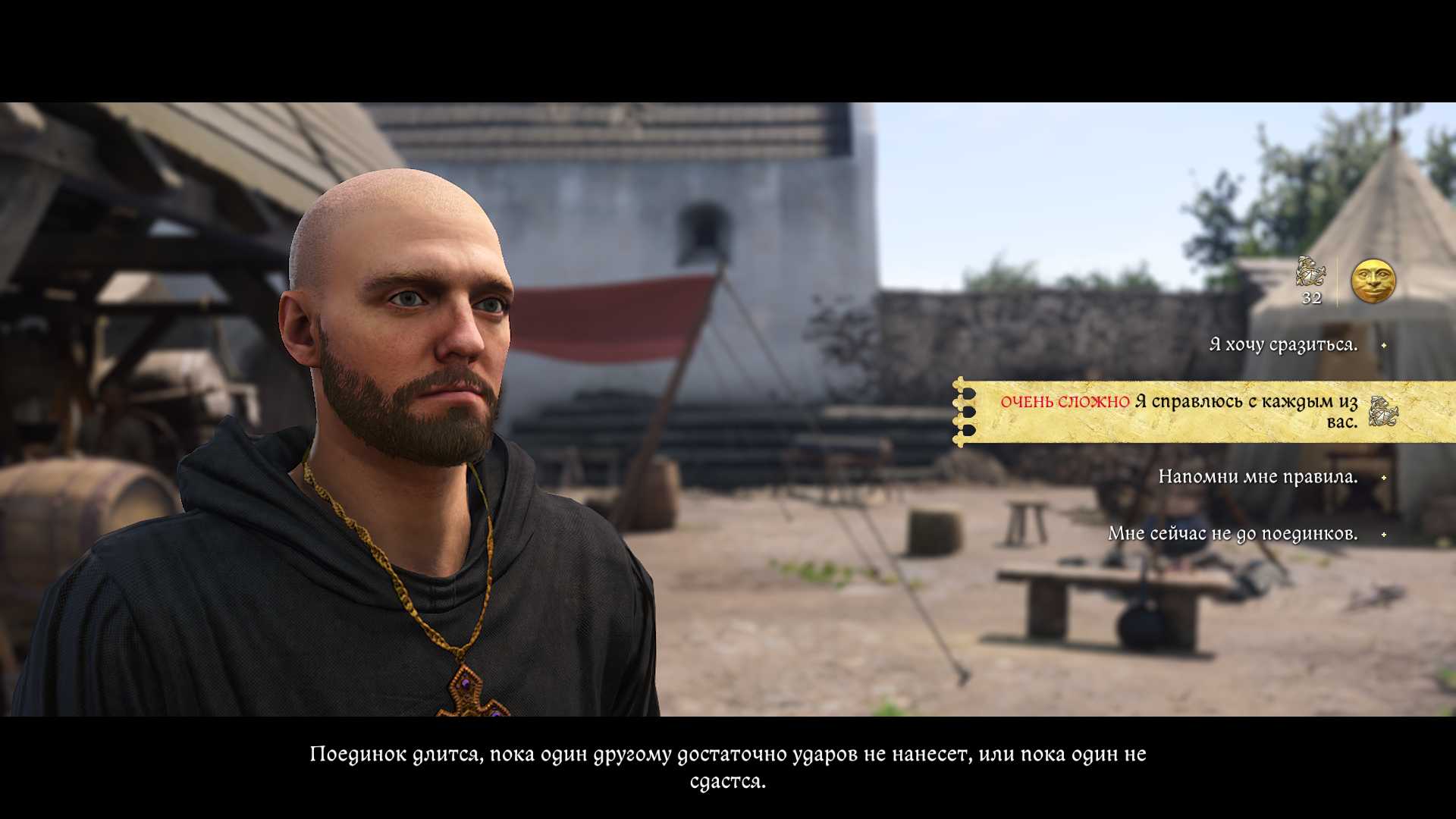 Первым предстоит одолеть монаха Марека на мечах — это несложно. Лучше не тяните время и сразу идите в атаку, так как в моем случае он сдался после пары-тройки пропущенных ударов.