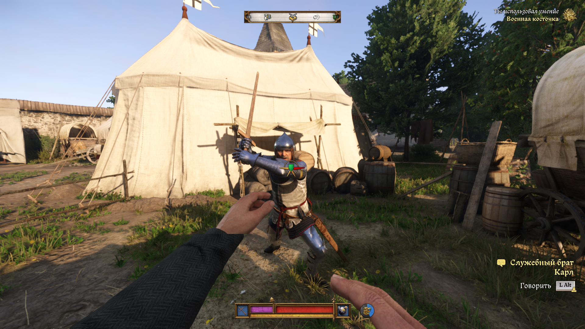 В лагере рыцарей возле ристалища вы найдете служебного брата Карла, который и предложит вам тренировочный поединок, а точнее небольшой товарищеский турнир из 3 раундов.