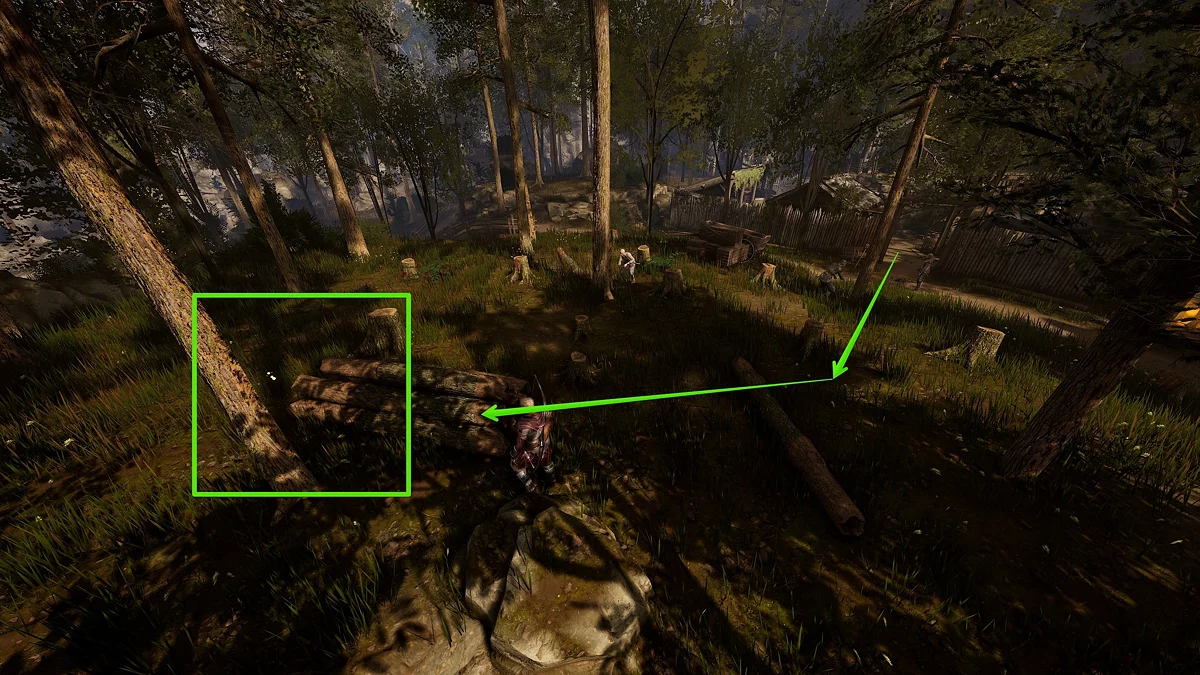 Затем покиньте лагерь и направляйтесь в зону лесозаготовки. Подойдите к стопке необработанных брёвен и отыщите за ними треснувшую бутылку из-под водки 🔍